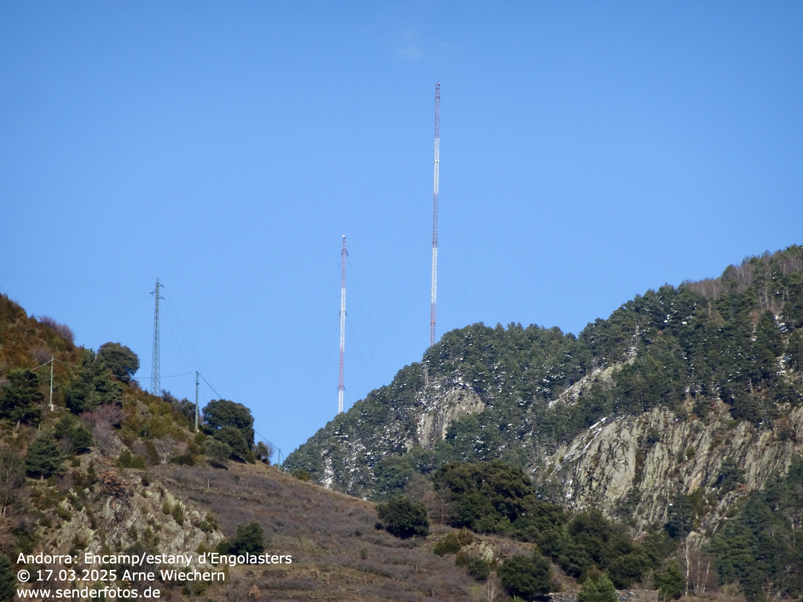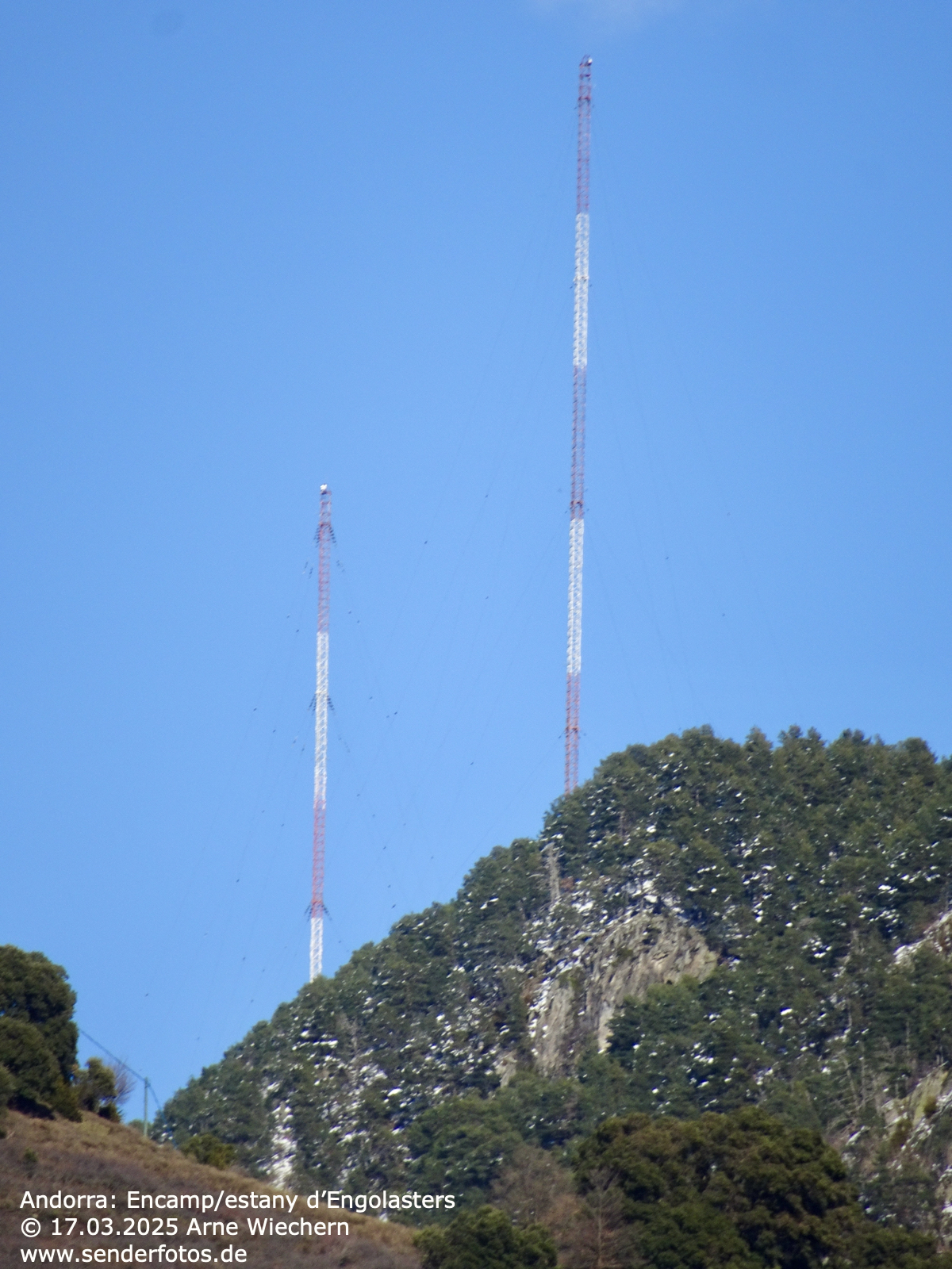 17. März 2025 – Die ehemalige Mittelwellen- und Kurzwellen-Sendeanlage auf einer Anhöhe im Osten der Stadt Andorra la Vella hat zwischen 1939 und dem 9. April 1981 die Signale von Radio Andorra übertragen. Auf Mittelwelle wurden hierfür die beiden sichtbaren, 125 m hohe Stahlfachwerkmasten auf der Frequenz 702 kHz mit einer Leistung von 300 kW genutzt. Einer der Masten diente hierbei als Sendeantenne, der andere als Reflektor. Hinzu kam an diesem Standort ein Kurzwellensender im 48/49m-Band mit einer Leistung von 25 kW.