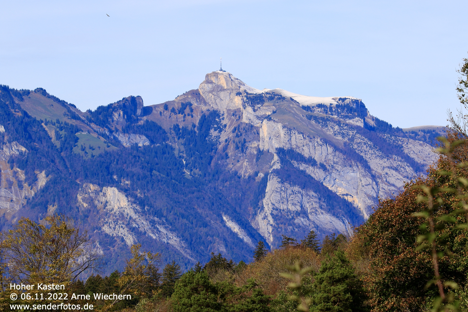 26.03.2022: Der Funkmast am Schenkenberg dient als Träger für die Sendeantenne von DKL Dreyeckland (103,8 MHz/1 kW). Die Sendeantenne befindet sich in einer Höhe von 16 m. Welchen Zweck die beiden Keramik-Isolatoren am unteren Ende der Abspannseile erfüllen, bleibt unklar.
