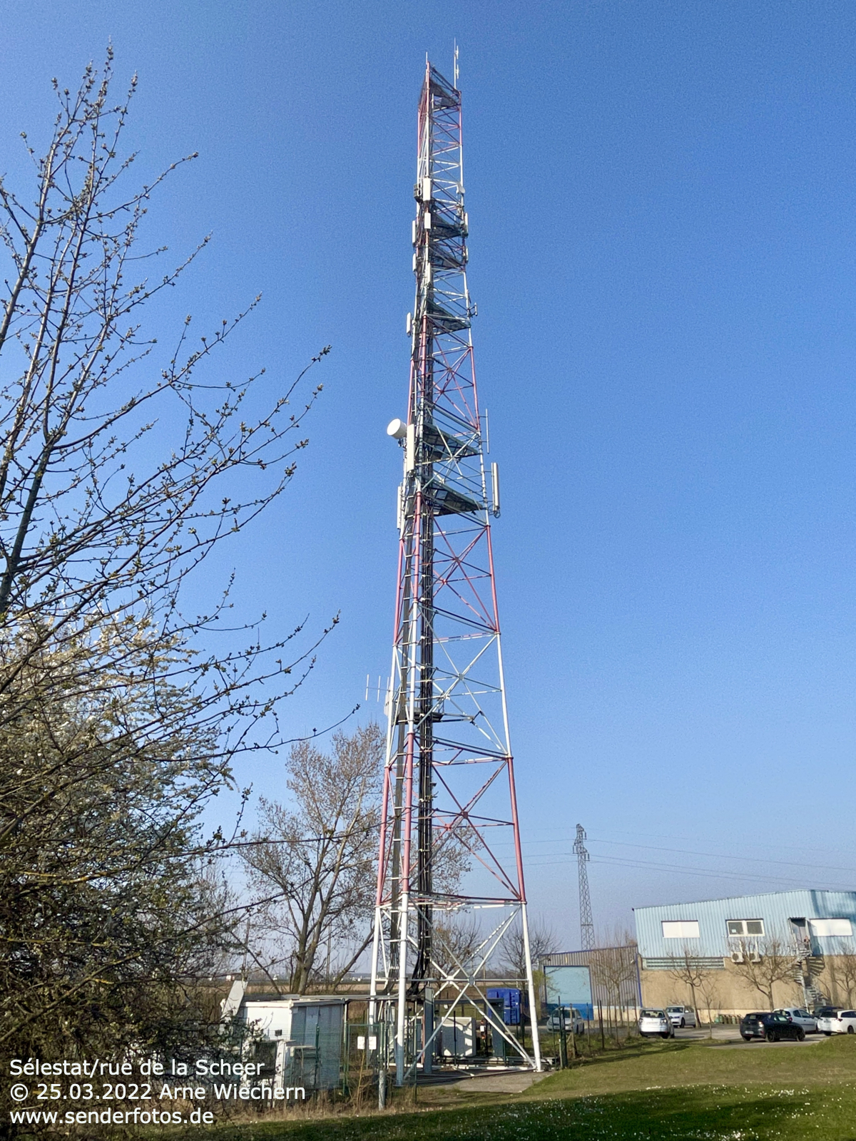 25.03.2021: Die Antennenanlage dieses Stahlgittermastes strahlt das Programm Virgin Radio Alsace (102,4 MHz/1 kW/64 m) aus. Vom benachbarten Wasserturm werden zwei weitere UKW-Programme gesendet.