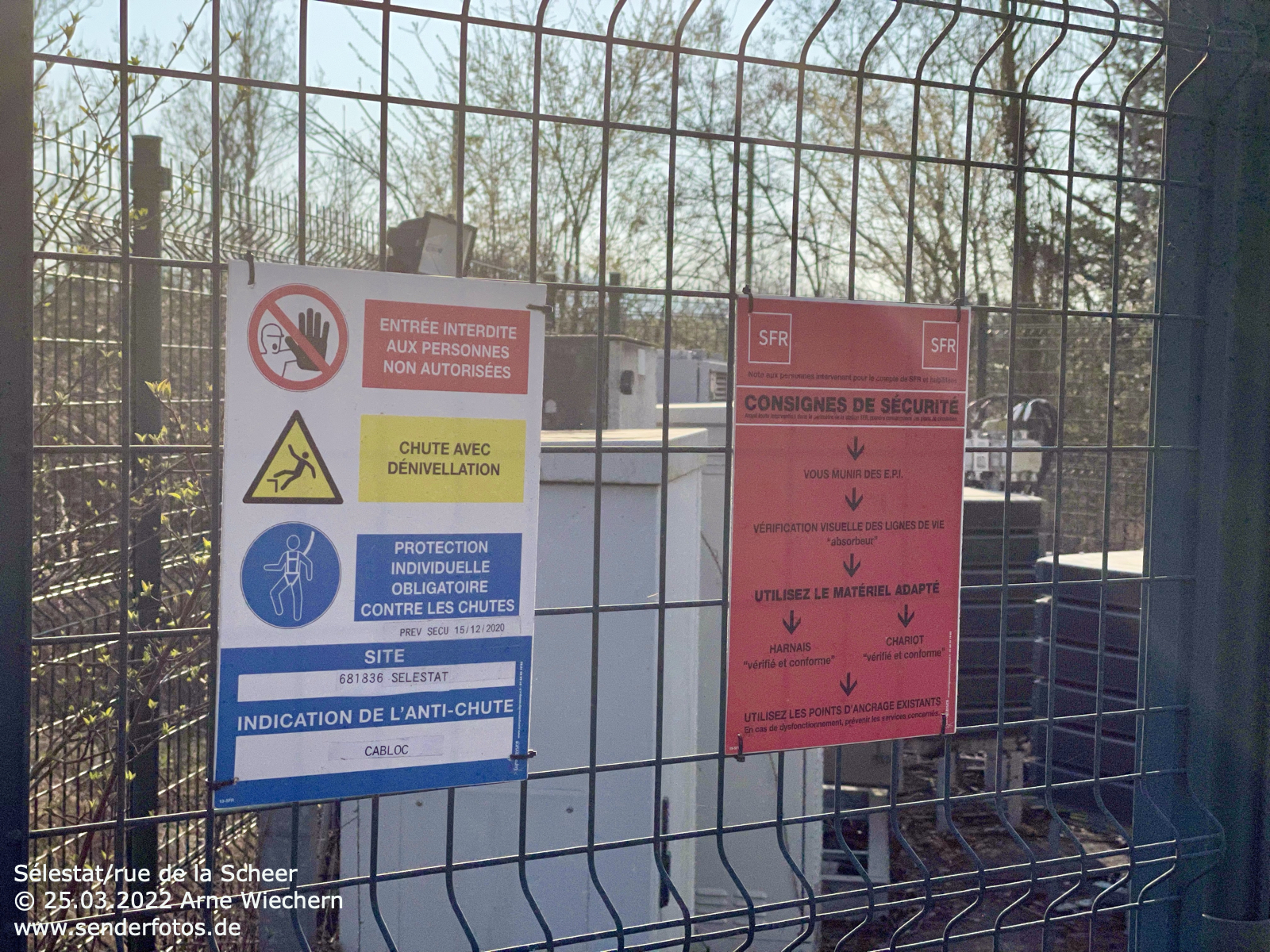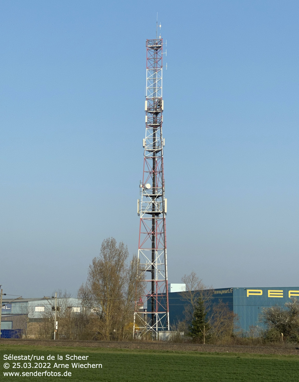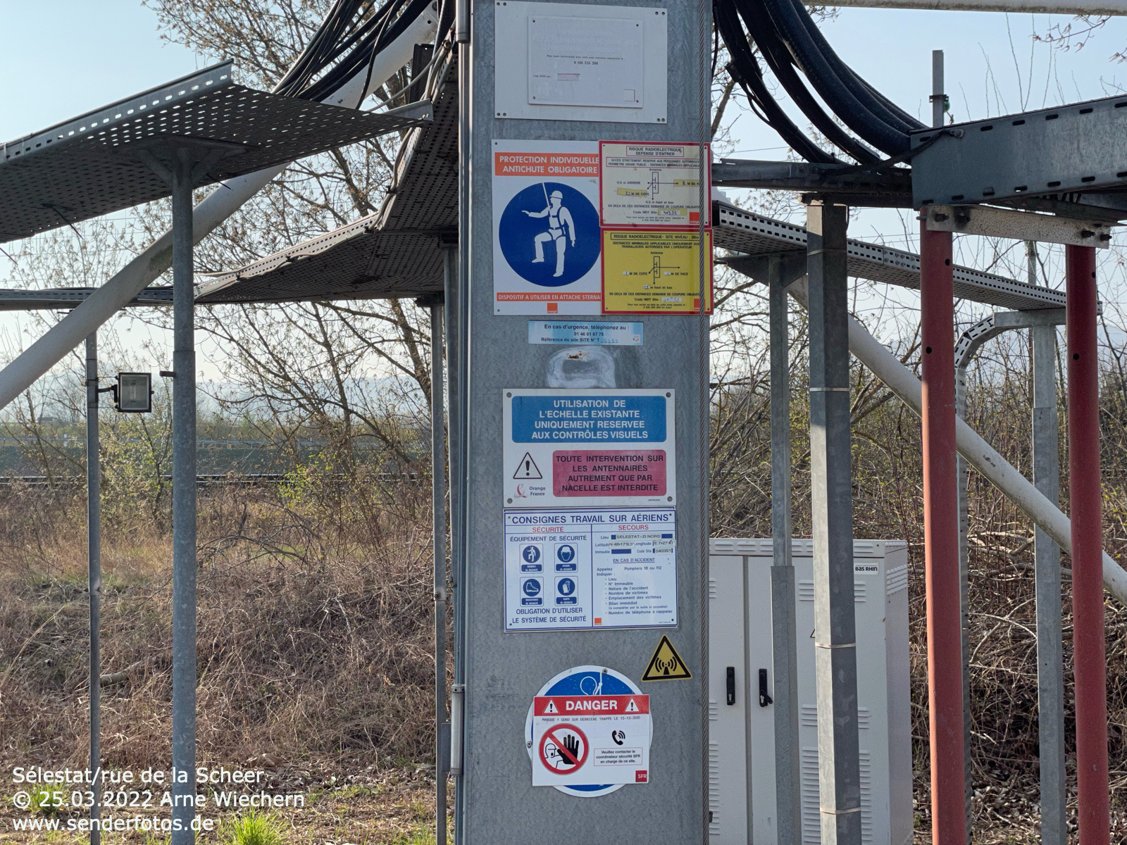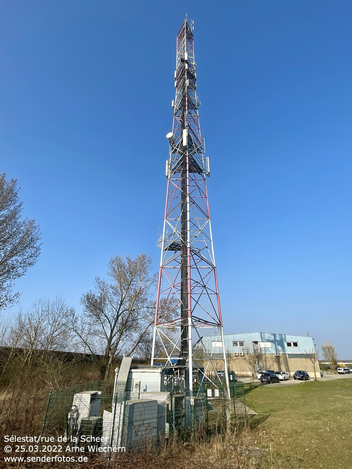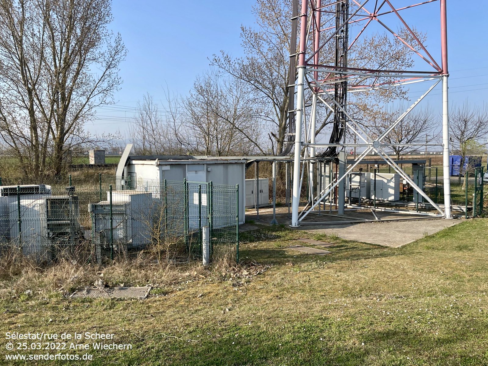25.03.2021: Von diesem Stahlgittermast im Osten der Stadt Saverne werden insgesamt vier Hörfunkprogramme auf UKW abgestrahlt: Rire et Chansons (88,6 MHz/0,1 kW/46 m), Europe 1 (103,3 MHz/0,5 kW/46 m), DKL Dreyeckland (103,6 MHz/0,1 kW/54 m) und RTL (107,3 MHz/0,2 kW/46 m).