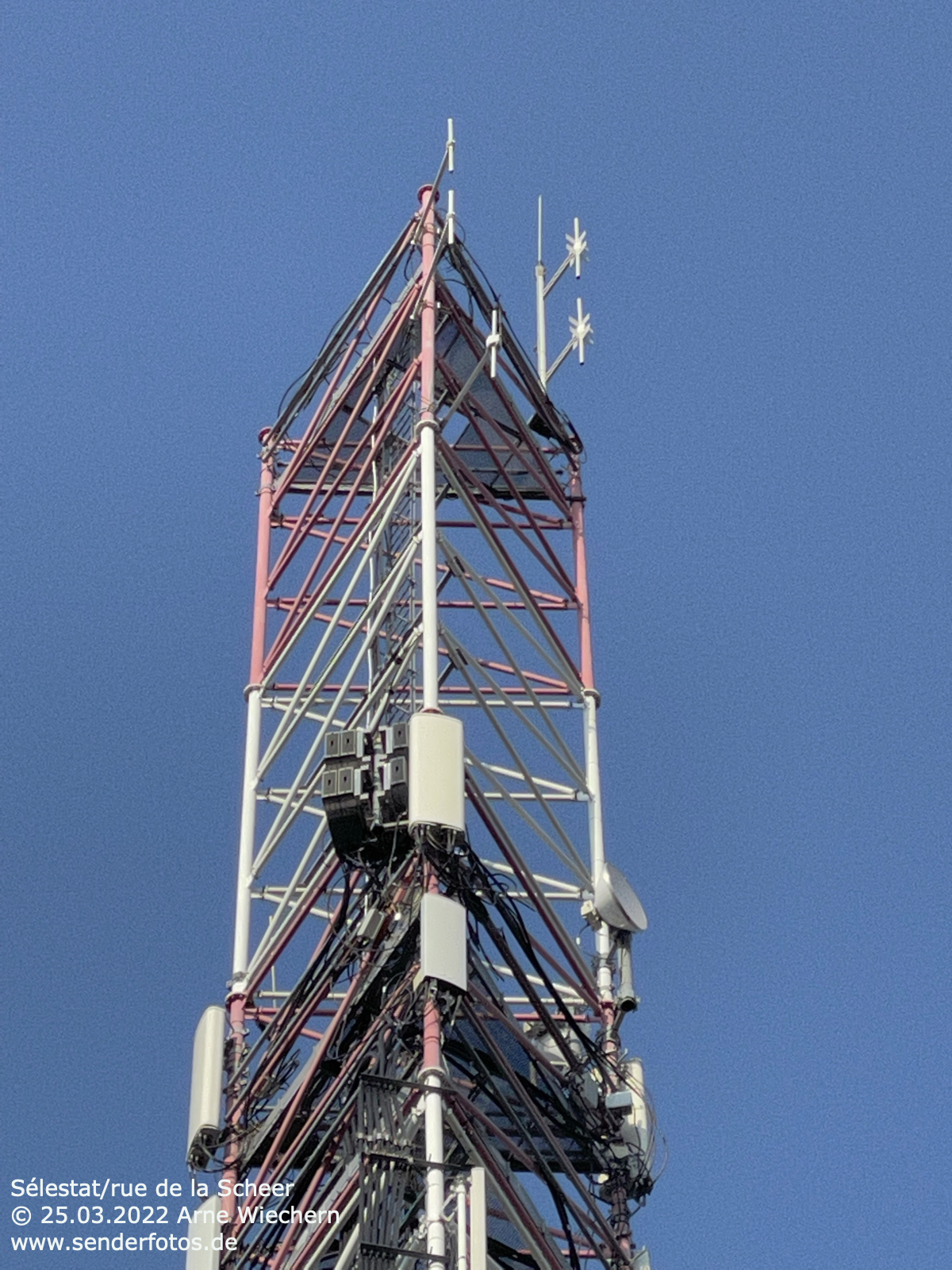 26.03.2022: Der etwa 63 m hohe Funkmast im Norden der elsässischen Stadt Sélestat (Schlettstadt) trägt an seiner Spitze mehrere Antennen, die für den Hörfunkbereich genutzt werden. In einer Höhe von 57 m befindet sich die Sendeantenne für DKL Dreyeckland (101,9 MHz/ 1 kW), die Antennen in 60 m Höhe werden von Top Music Sélestat (90,1 MHz/1 kW) und Accent 4 (98,8 MHz/1 kW) genutzt. An der Spitze des Masts wurde bereits eine DAB+-Antenne montiert. Vorgesehen ist der Multiplex RNT Sélestat (Kanal 5D/10 kW).
