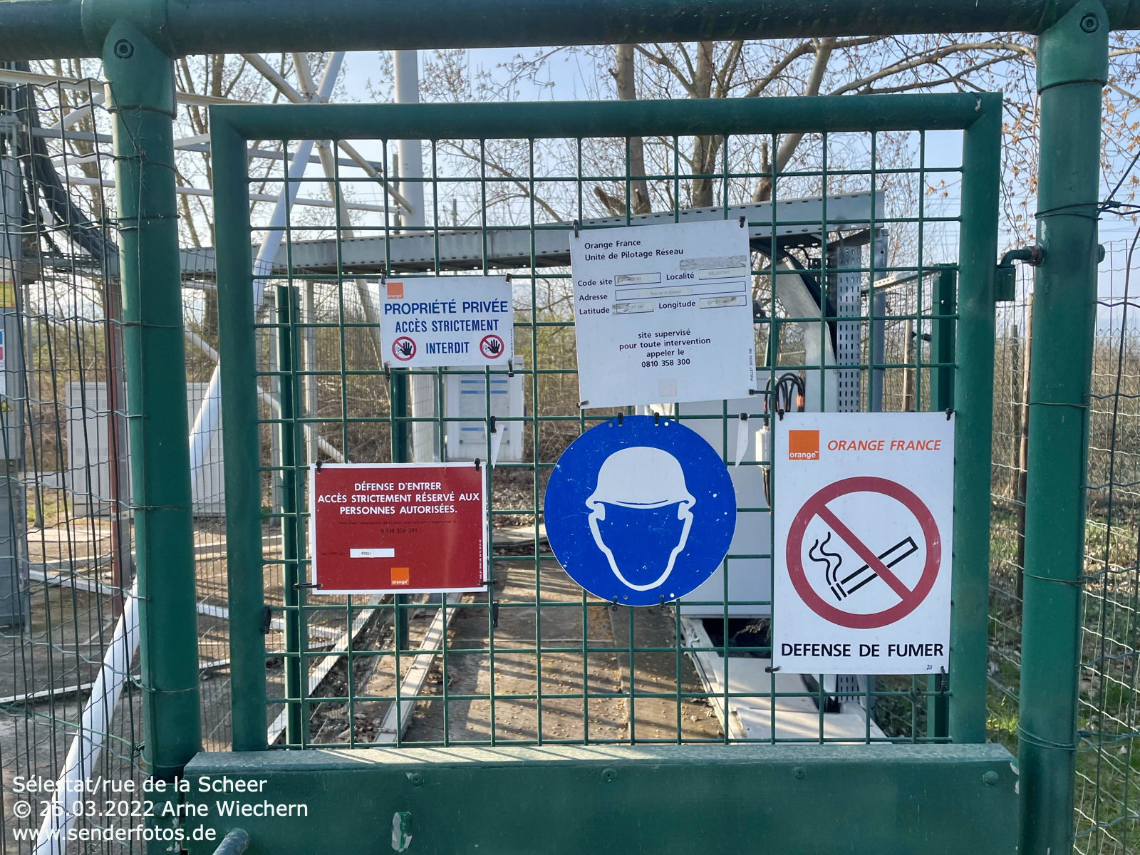 26.03.2022: Etwa 5 km südwestlich der Kleinstadt Bitche befindet sich auf einer Hügelkette die Sendeanlage des Lokalradios „Radio Studio 1“. Aus einer Antennenhöhe von 43 m über Grund wird das Programm auf 105,8 MHz (1 kW) ausgestrahlt. Für die Sendeantenne wurde im Zeitraum 2021/22 ein neuer Mast errichtet, der sich etwa 200 m westlich der bisherigen Anlage befindet. Zum Zeitpunkt der Aufnahme stand der alte Mast noch, zeigte sich aber bereits in schlechtem Zustand. Auffällig: An dessen Spitze befanden sich deutlich mehr Dipole als am neuen Mast. Dies deutet daraufhin, dass möglicherweise in früheren Jahren weitere Programme von dieser Anlage ausgestrahlt wurden.
