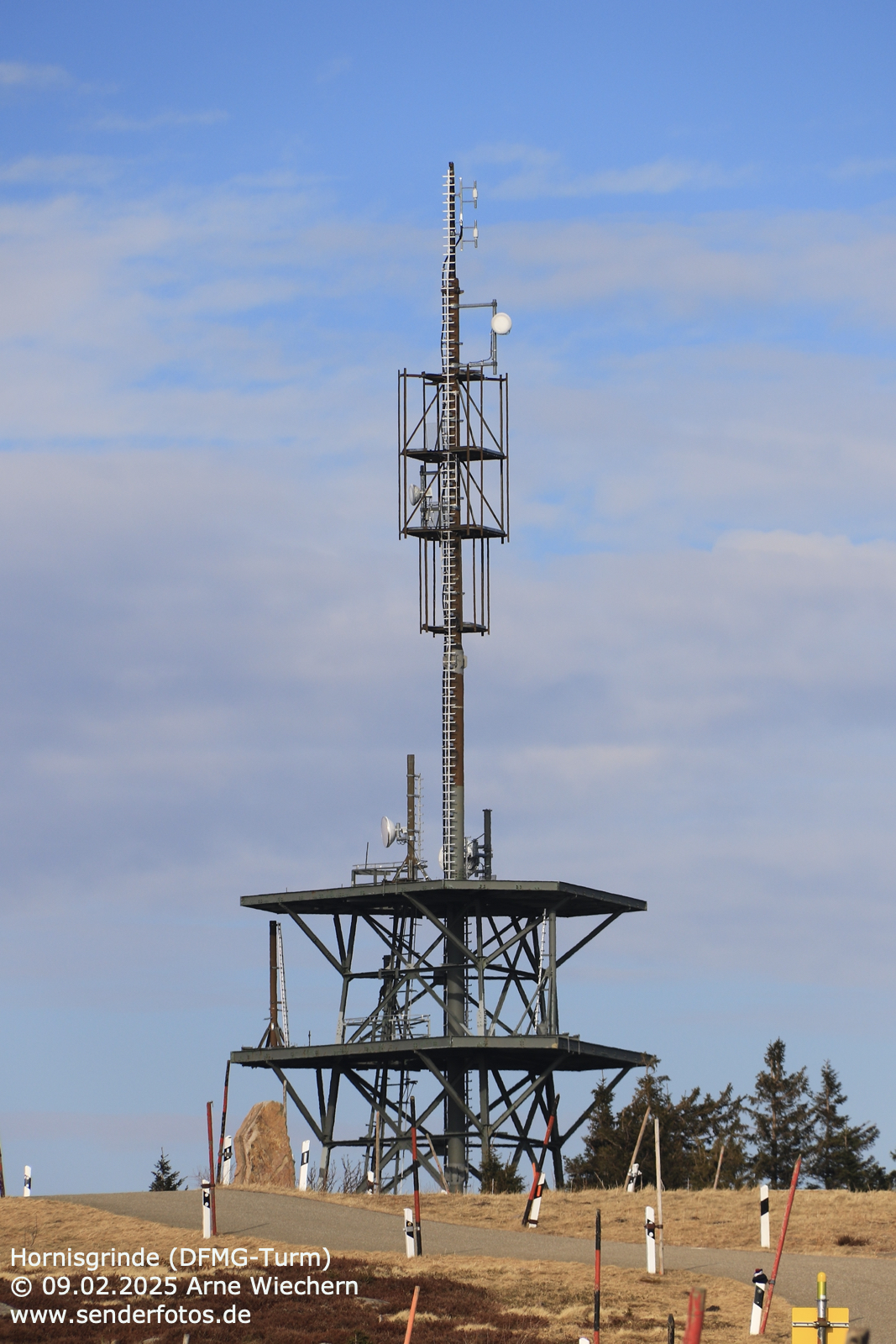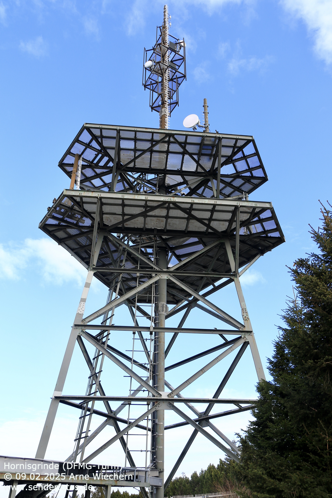 (DFMG) – 10.02.2025: Vom 400 m nördlich des SWR-Sendeturms Hornisgrinde gelegenen DFMG-Funkturm wurde bis zum Jahr 2005 das Programm des Deutschlandfunks auf der Frequenz 106,3 MHz ausgestrahlt. Anschließend wurde die Frequenz zum SWR-Sendeturm verlagert, und der DFMG-Sendeturm wurde für viele Jahre nicht mehr zur Ausstrahlung öffentlich empfangbarer Programme genutzt. Installiert war weiterhin eine Relais-Station für das Amateurfunk-Fernsehen. Erst im Jahr 2023 wurde eine DAB+-Sendeantenne an der Spitze des Turms angebracht. Seit dem 28. September 2023 wird der DR-Deutschland-Multiplex (Kanal 5C/2 kW) ausgestrahlt.