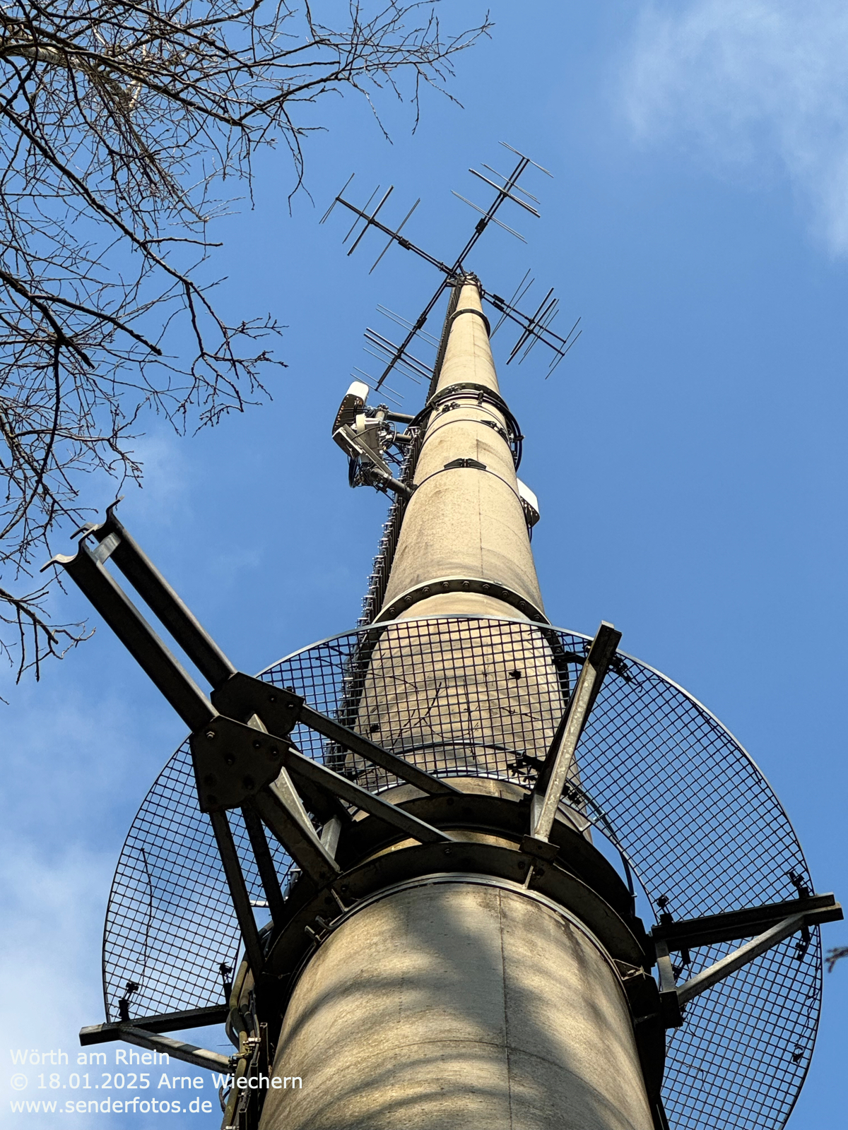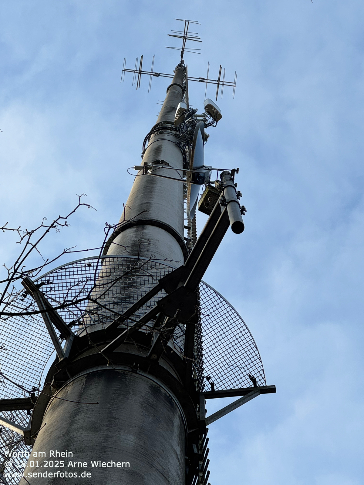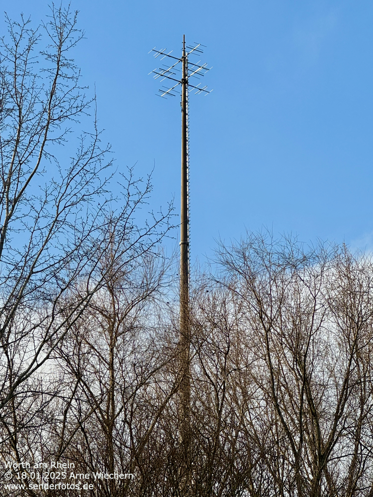 (DFMG) – 10.02.2025: An der Spitze des 71 m hohen Masts im Osten von Wörth am Rhein befinden sich Yagi-Antennen, von denen das Programm von Deutschlandfunk Kultur (96,6 MHz/0,2 kW) ausgestrahlt wird.