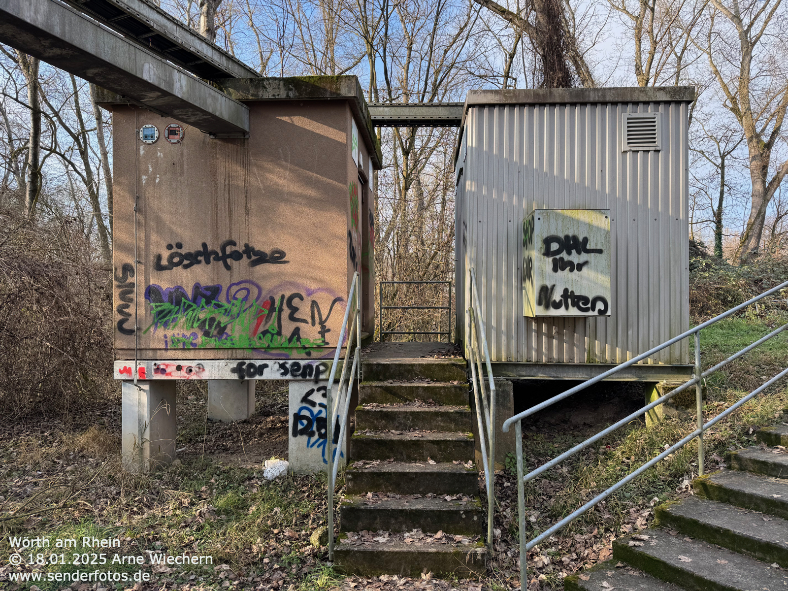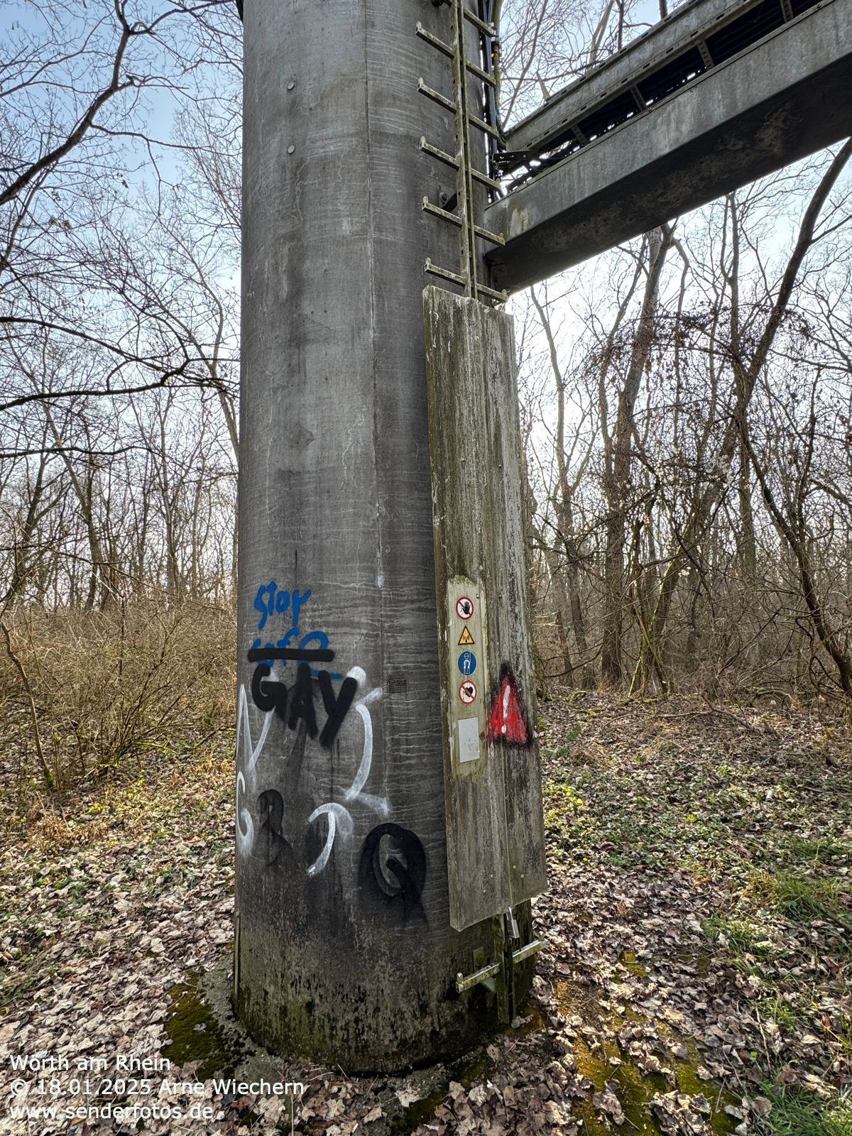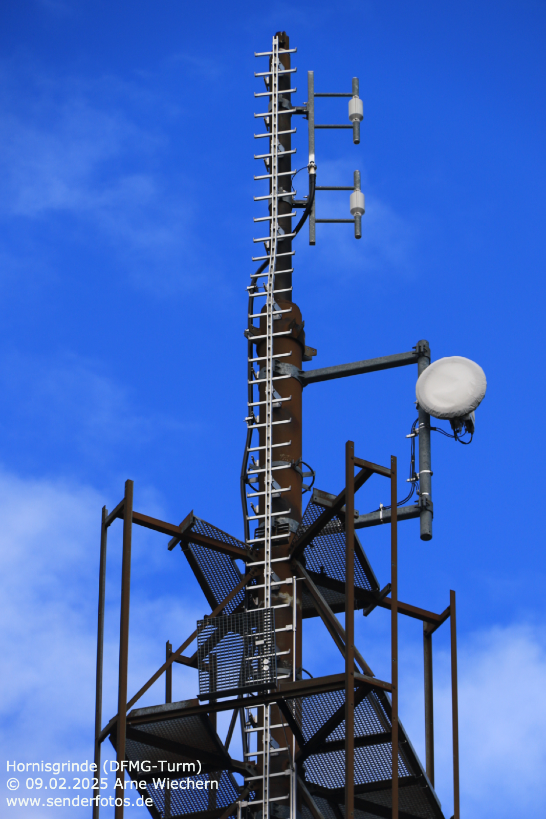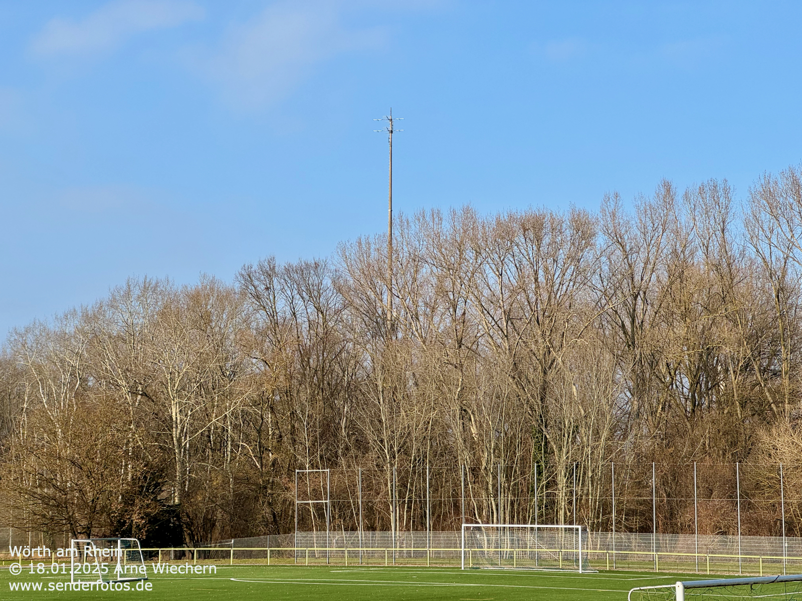 (DFMG) – 10.02.2025: An der Spitze des 71 m hohen Masts im Osten von Wörth am Rhein befinden sich Yagi-Antennen, von denen das Programm von Deutschlandfunk Kultur (96,6 MHz/0,2 kW) ausgestrahlt wird.
