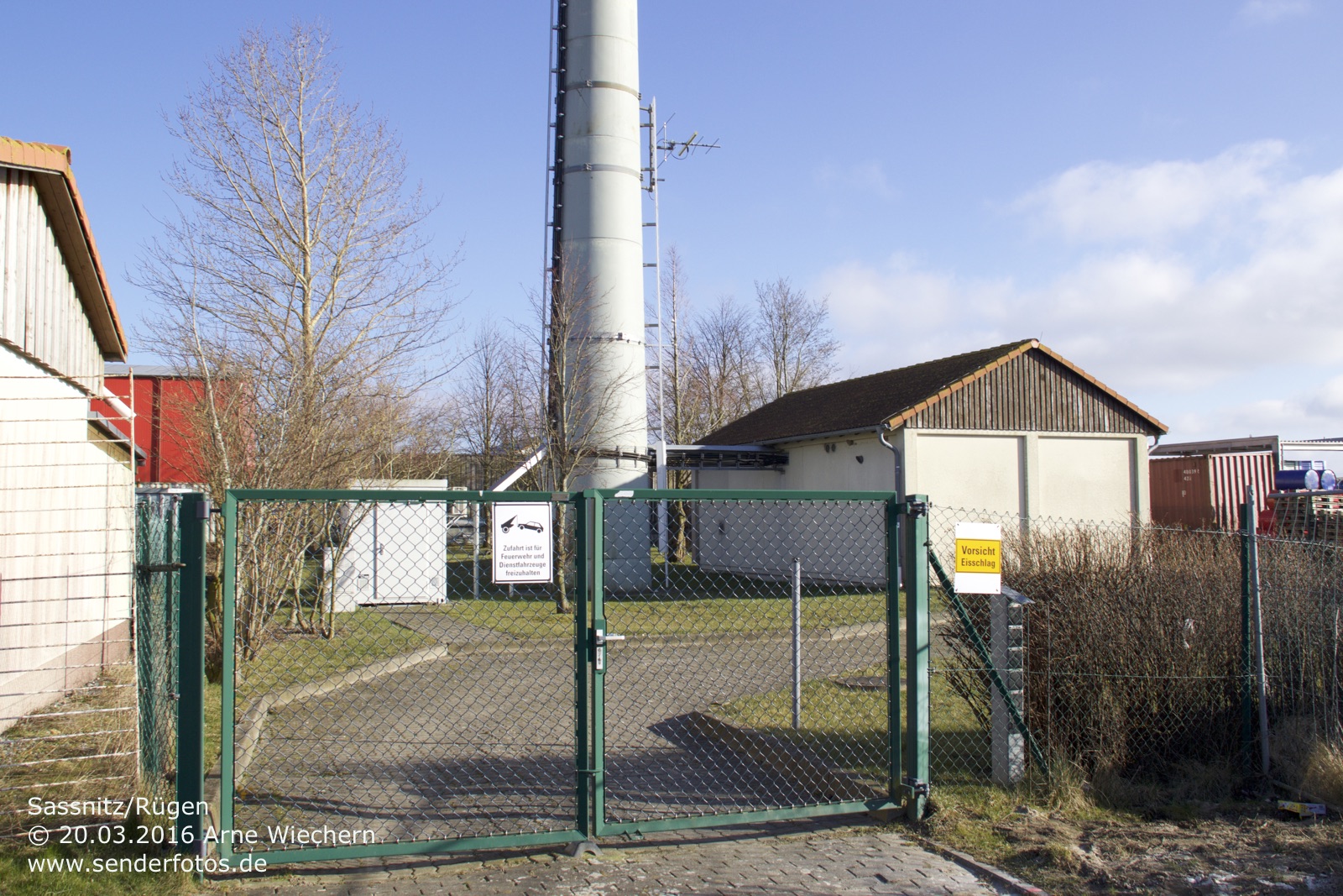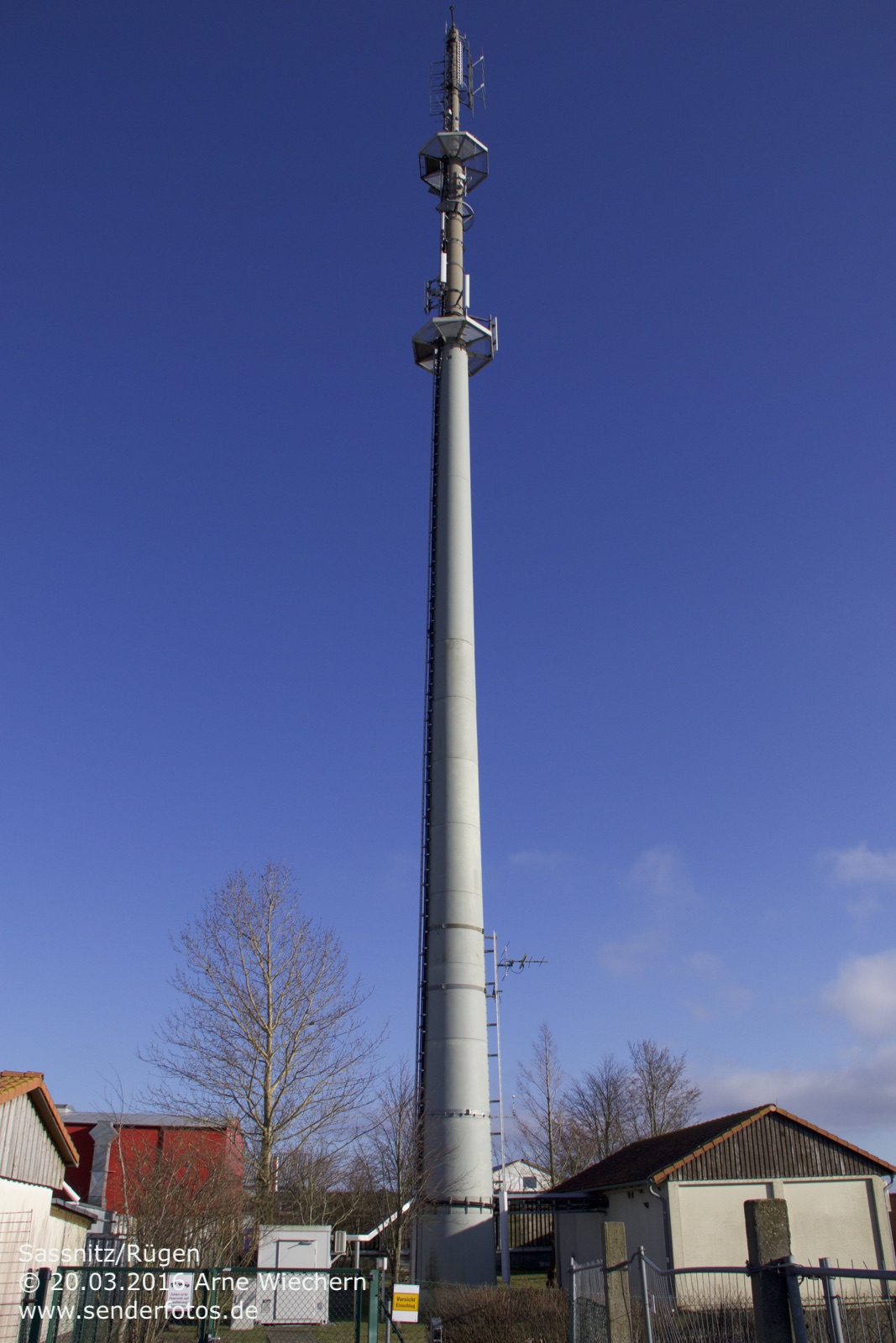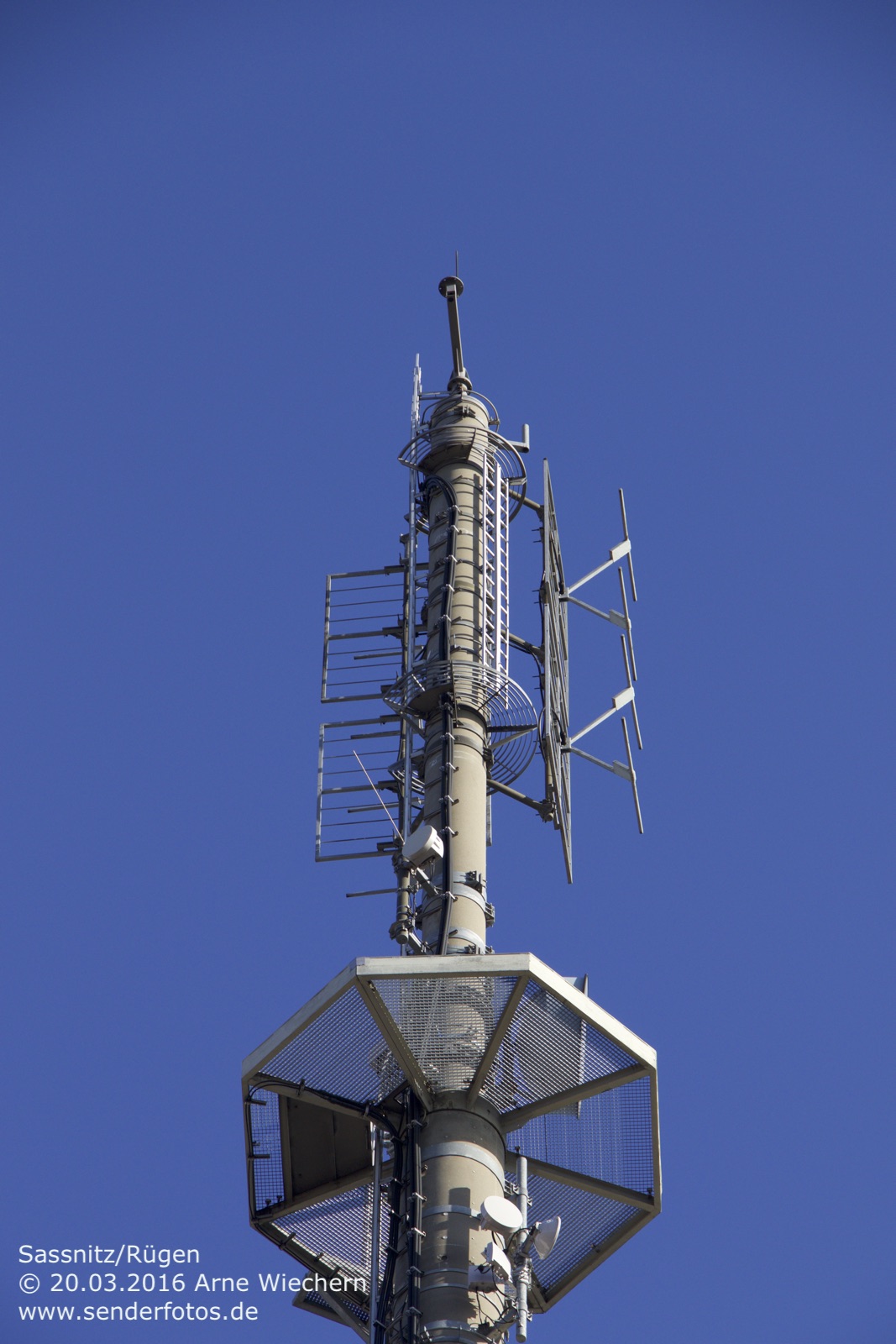 (DFMG Deutsche Funkturm GmbH) – 21.03.2016: Nahe der Spitze eines Mobilfunkmasts im Südwesten von Sassnitz sind in 63 m Höhe Antennenfelder montiert, die für die Ausstrahlung von DeutschlandRadio Kultur auf 101,4 MHz und Deutschlandfunk auf 104,0 MHz genutzt werden. Die Sendeleistung beträgt in beiden Fällen 8 kW.