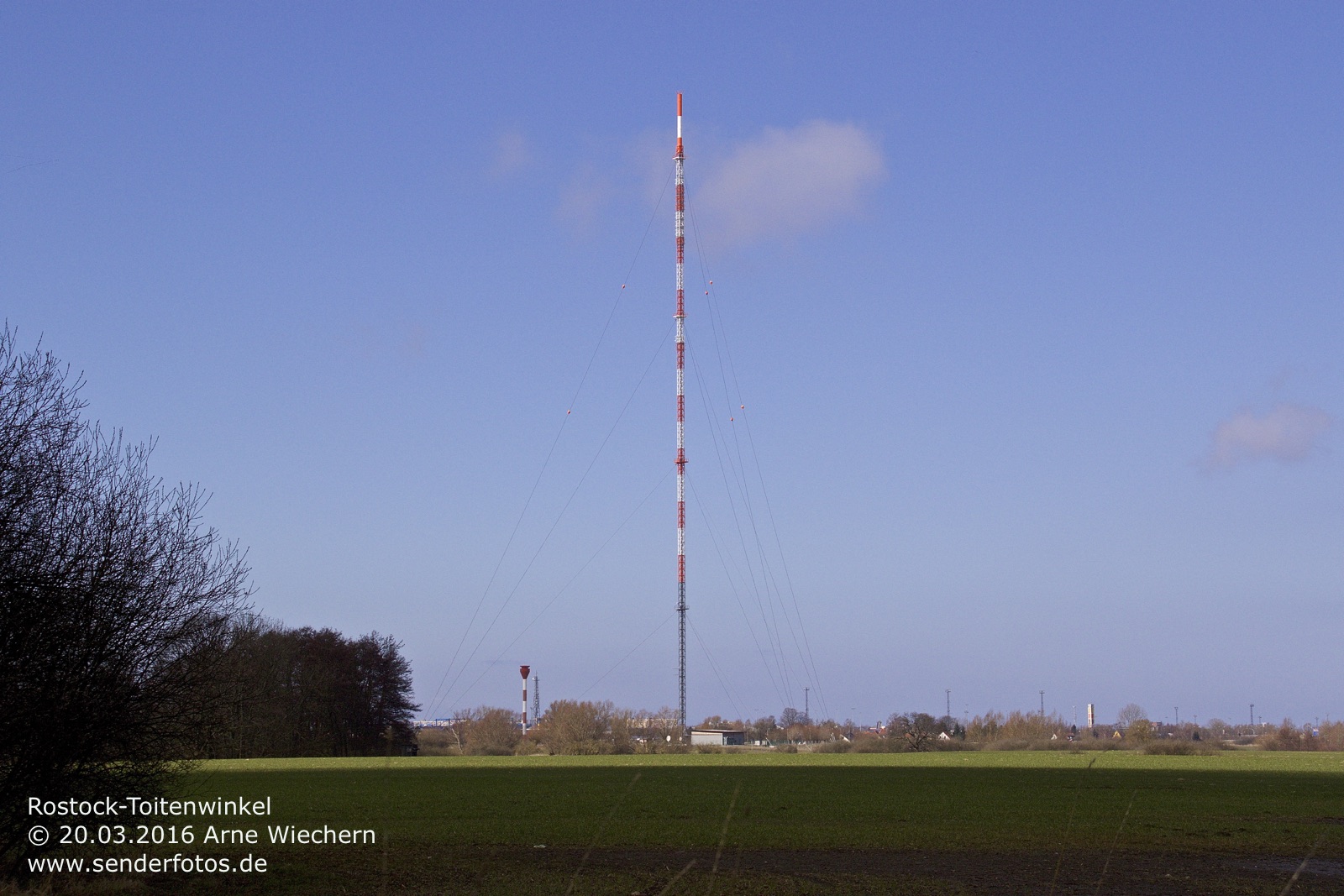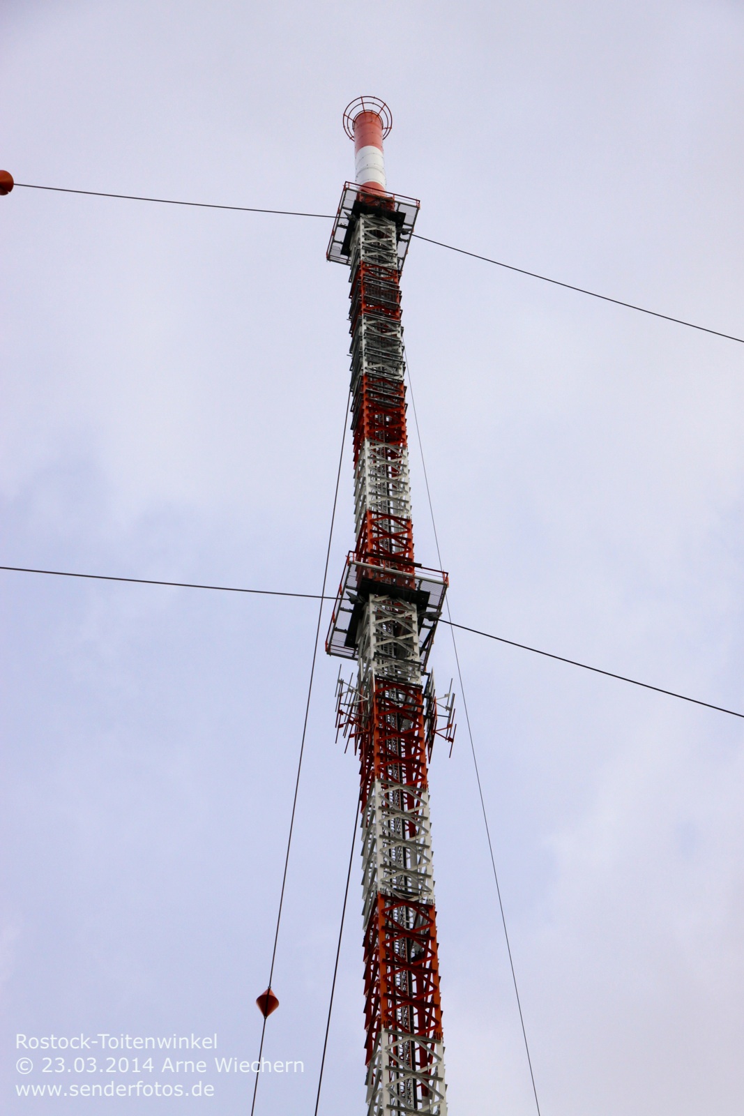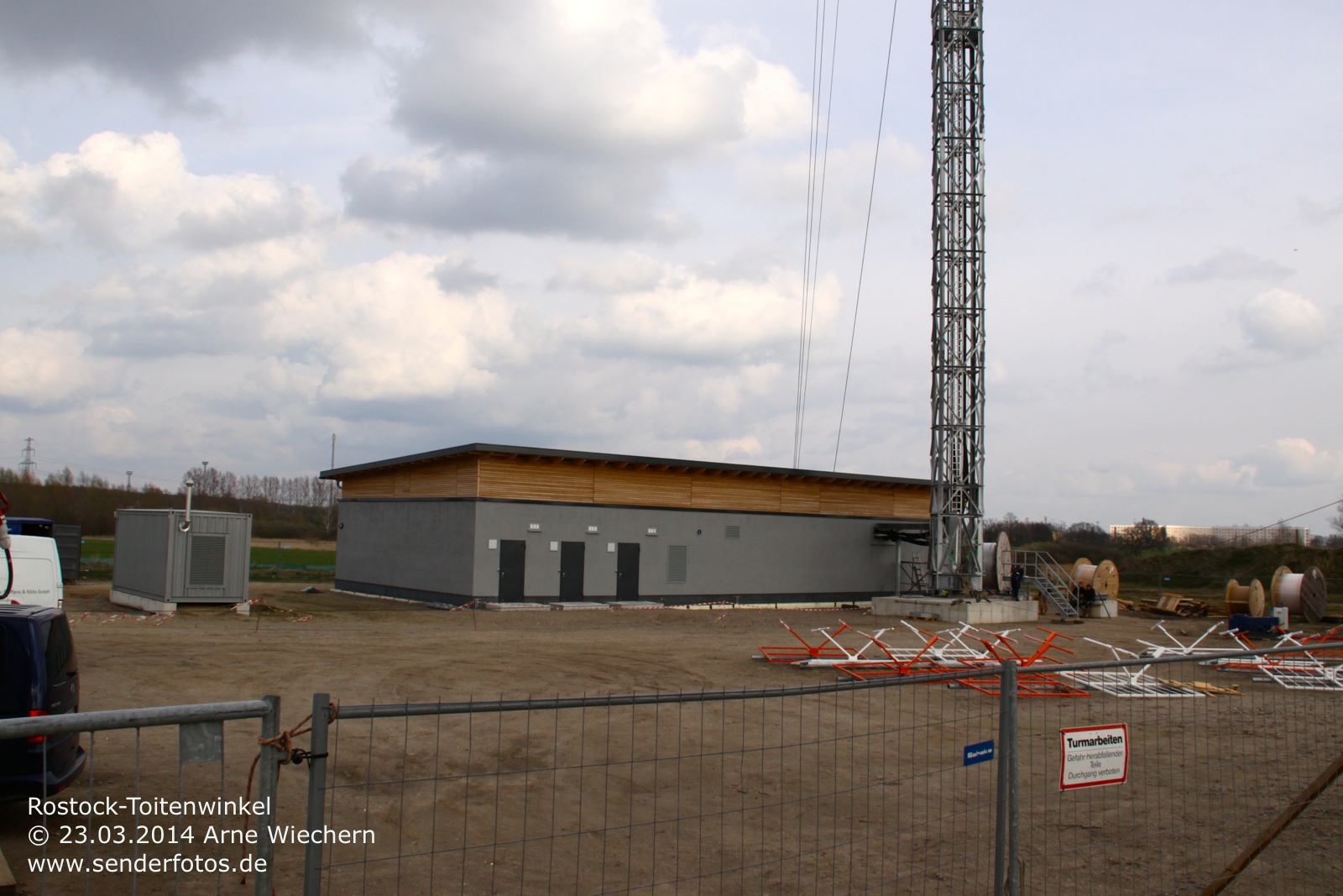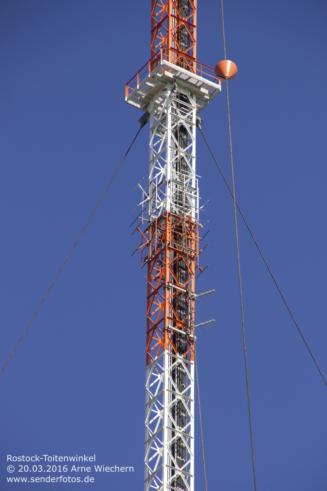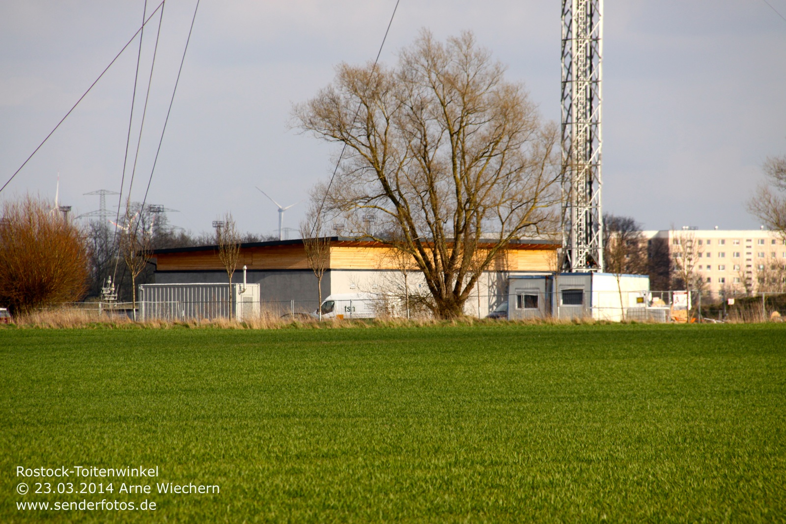 (DFMG) – 23.03.2014: Im Jahr 2012 war bekanntgeworden, dass ein neuer Sendemast in Rostock den bisherigen Sender Marlow ersetzen soll. Baubeginn auf einem Grundstück zwischen den Ortsteilen Toitenwinkel und Krummendorf war am 22. April 2013 – mit dem Aufbau des Stahlgittermasts wurde am 8. Oktober 2013 begonnen. Die Baukosten betrugen 2,6 Mio. Euro. Von diesem 245 m hohen Mast sollen künftig Hörfunkprogramme im UKW- und DAB plus-Bereich sowie Fernsehen im DVB-T-Modus abgestrahlt werden. UKW-Antennen sind auf zwei Ebenen (145 und 187 m) montiert, Die DAB-Antennen (225 m) befinden sich ebenso wie die DVB-T-Antennen (231 m) im GFK-Zylinder an der Spitze des Turms. Abgestrahlt werden künftig von der oberen Antenneneben: NDR Kultur (88,2 MHz/160 kW), NDR 1 Radio MV (91,0 MHz/100 kW), NDR 2 (93,5 MHz/40 kW), DeutschlandRadio Kultur (96,7 MHz/40 kW), Antenne MV (100,8 MHz/130 kW), NDR Info (102,8 MHz/100 kW) und Ostseewelle (104,8 MHz/100 kW). Die Sender für NDR Kultur (160 kW) und Antenne MV (130 kW) werden damit die leistungsstärksten UKW-Sender Deutschlands sein. Die untere Antennenebene nutzen: N-Joy (88,9 MHz/5 kW) und Lohro (90,2 MHz/0,1 kW). Außerdem sind für diese Ebene die Frequenzen 97,3 MHz (5 kW) und 105,6 MHz (0,2 kW) koordiniert. Im DVB-T-Bereich ist davon auszugehen, dass die beiden derzeit vom Fernsehturm Rostock-Stadtweide abgestrahlten Bouquets (NDR-MVP, Kanal 29, 1 kW und ZDFmobil, Kanal 46, 1 kW) nach Toitenwinkel umziehen werden.