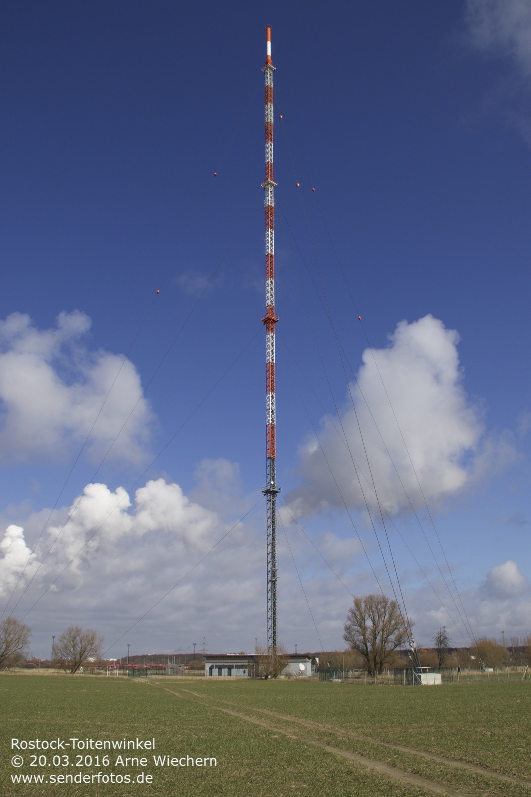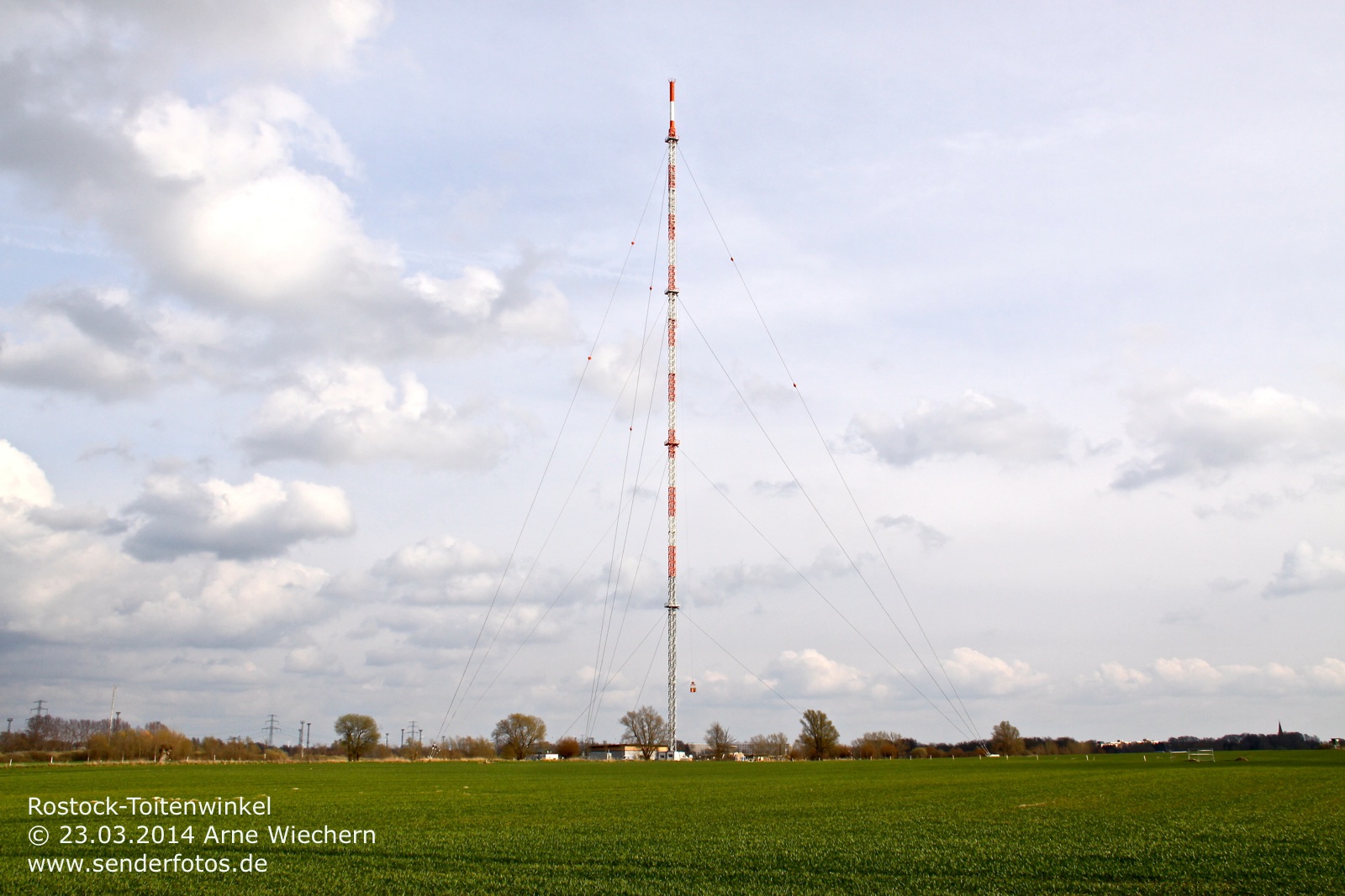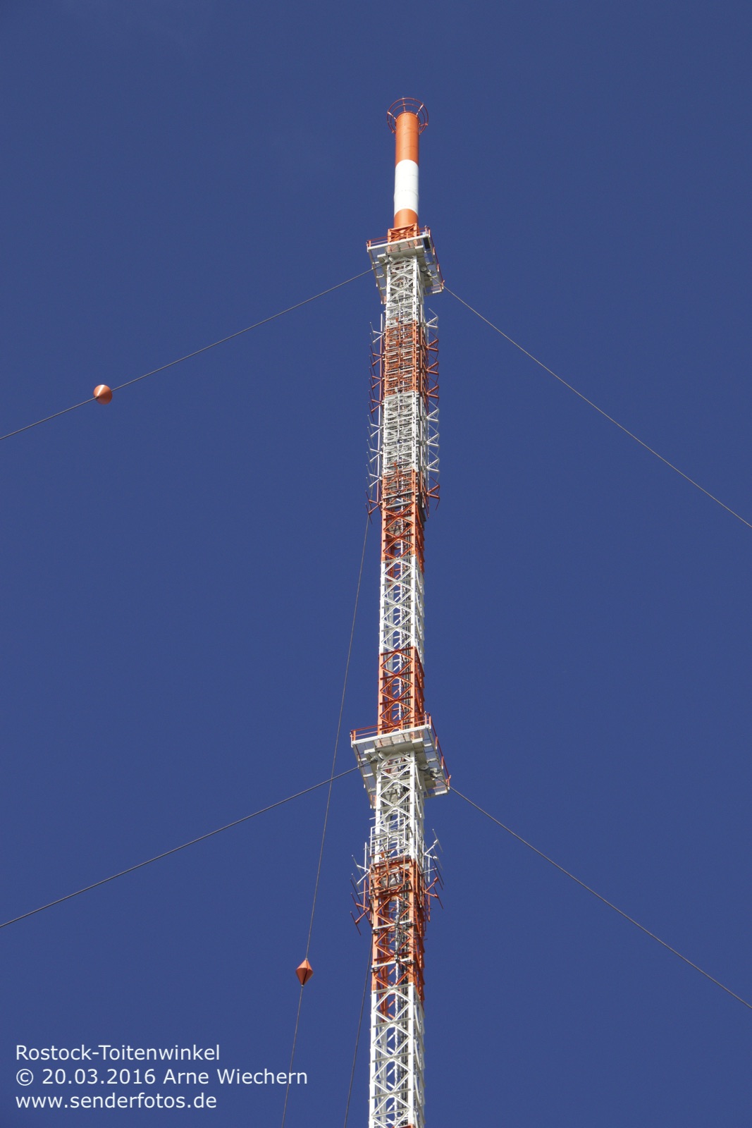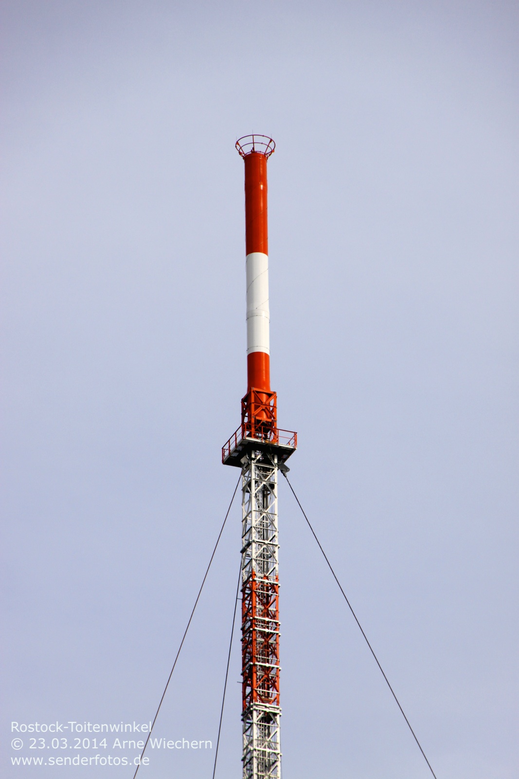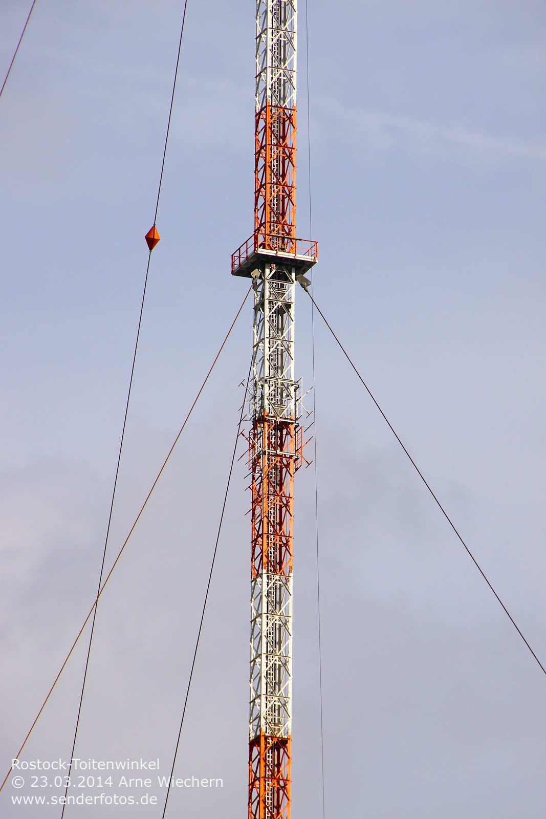 (DFMG) – 23.03.2014: Im Jahr 2012 war bekanntgeworden, dass ein neuer Sendemast in Rostock den bisherigen Sender Marlow ersetzen soll. Baubeginn auf einem Grundstück zwischen den Ortsteilen Toitenwinkel und Krummendorf war am 22. April 2013 – mit dem Aufbau des Stahlgittermasts wurde am 8. Oktober 2013 begonnen. Die Baukosten betrugen 2,6 Mio. Euro. Von diesem 245 m hohen Mast sollen künftig Hörfunkprogramme im UKW- und DAB plus-Bereich sowie Fernsehen im DVB-T-Modus abgestrahlt werden. UKW-Antennen sind auf zwei Ebenen (145 und 187 m) montiert, Die DAB-Antennen (225 m) befinden sich ebenso wie die DVB-T-Antennen (231 m) im GFK-Zylinder an der Spitze des Turms. Abgestrahlt werden künftig von der oberen Antenneneben: NDR Kultur (88,2 MHz/160 kW), NDR 1 Radio MV (91,0 MHz/100 kW), NDR 2 (93,5 MHz/40 kW), DeutschlandRadio Kultur (96,7 MHz/40 kW), Antenne MV (100,8 MHz/130 kW), NDR Info (102,8 MHz/100 kW) und Ostseewelle (104,8 MHz/100 kW). Die Sender für NDR Kultur (160 kW) und Antenne MV (130 kW) werden damit die leistungsstärksten UKW-Sender Deutschlands sein. Die untere Antennenebene nutzen: N-Joy (88,9 MHz/5 kW) und Lohro (90,2 MHz/0,1 kW). Außerdem sind für diese Ebene die Frequenzen 97,3 MHz (5 kW) und 105,6 MHz (0,2 kW) koordiniert. Im DVB-T-Bereich ist davon auszugehen, dass die beiden derzeit vom Fernsehturm Rostock-Stadtweide abgestrahlten Bouquets (NDR-MVP, Kanal 29, 1 kW und ZDFmobil, Kanal 46, 1 kW) nach Toitenwinkel umziehen werden.