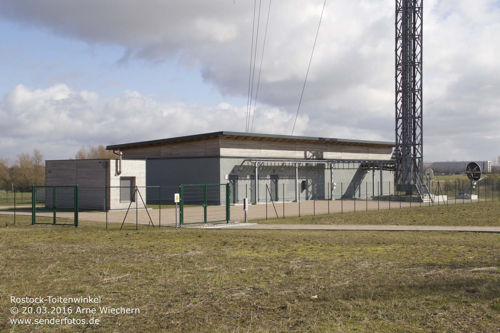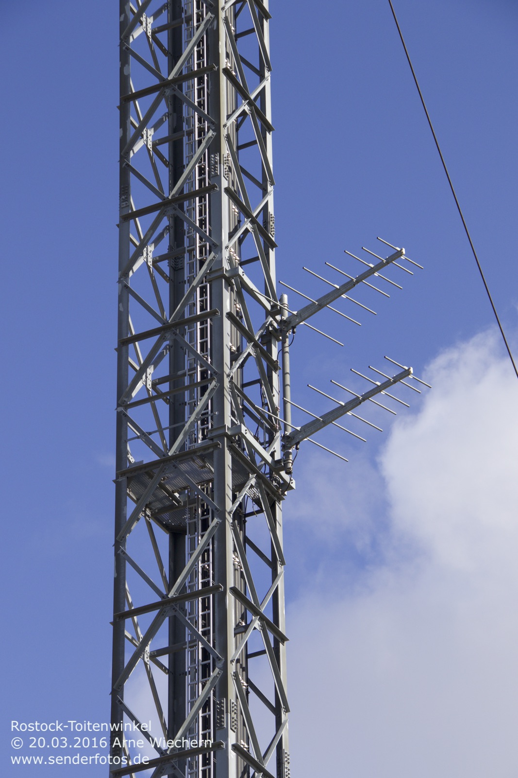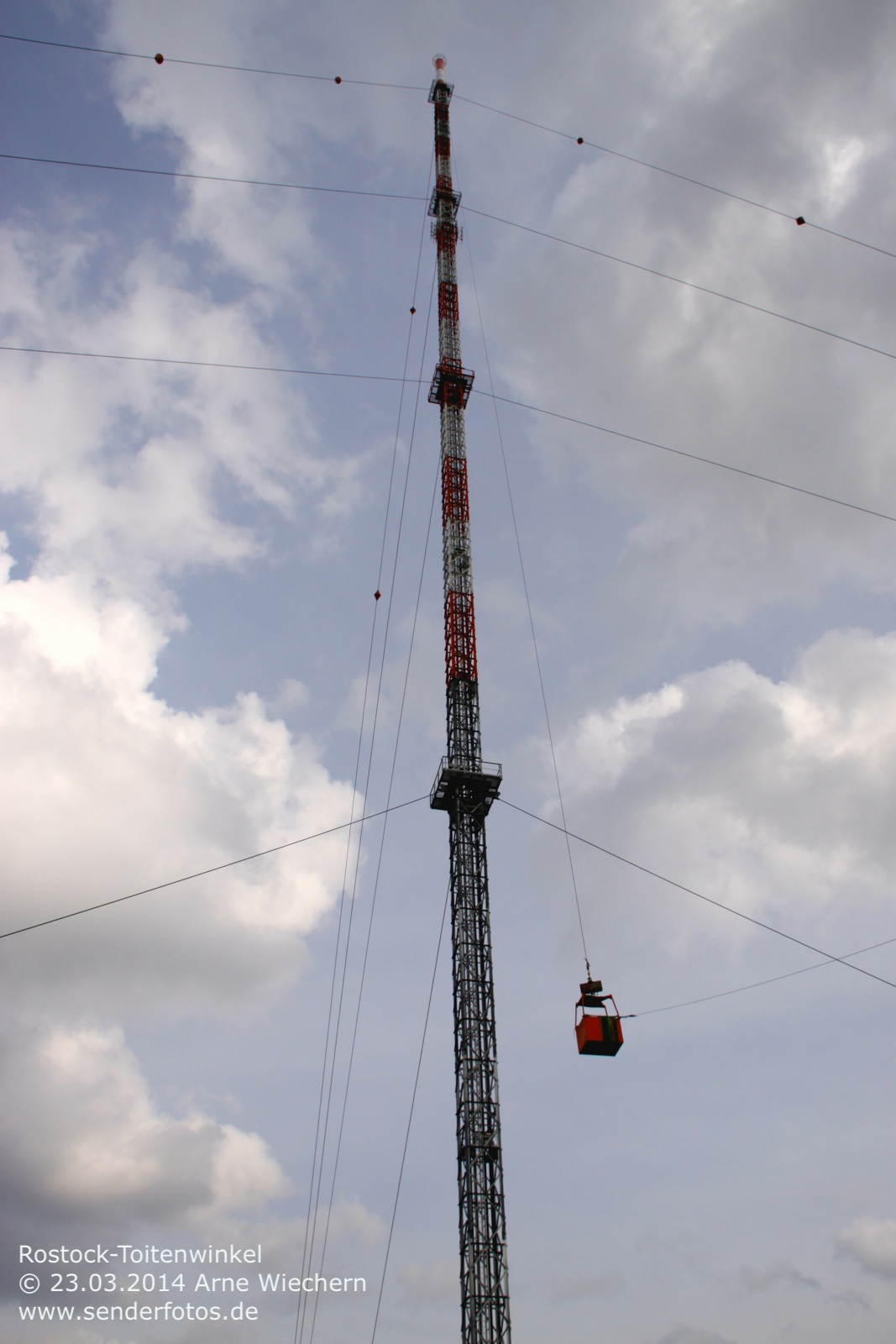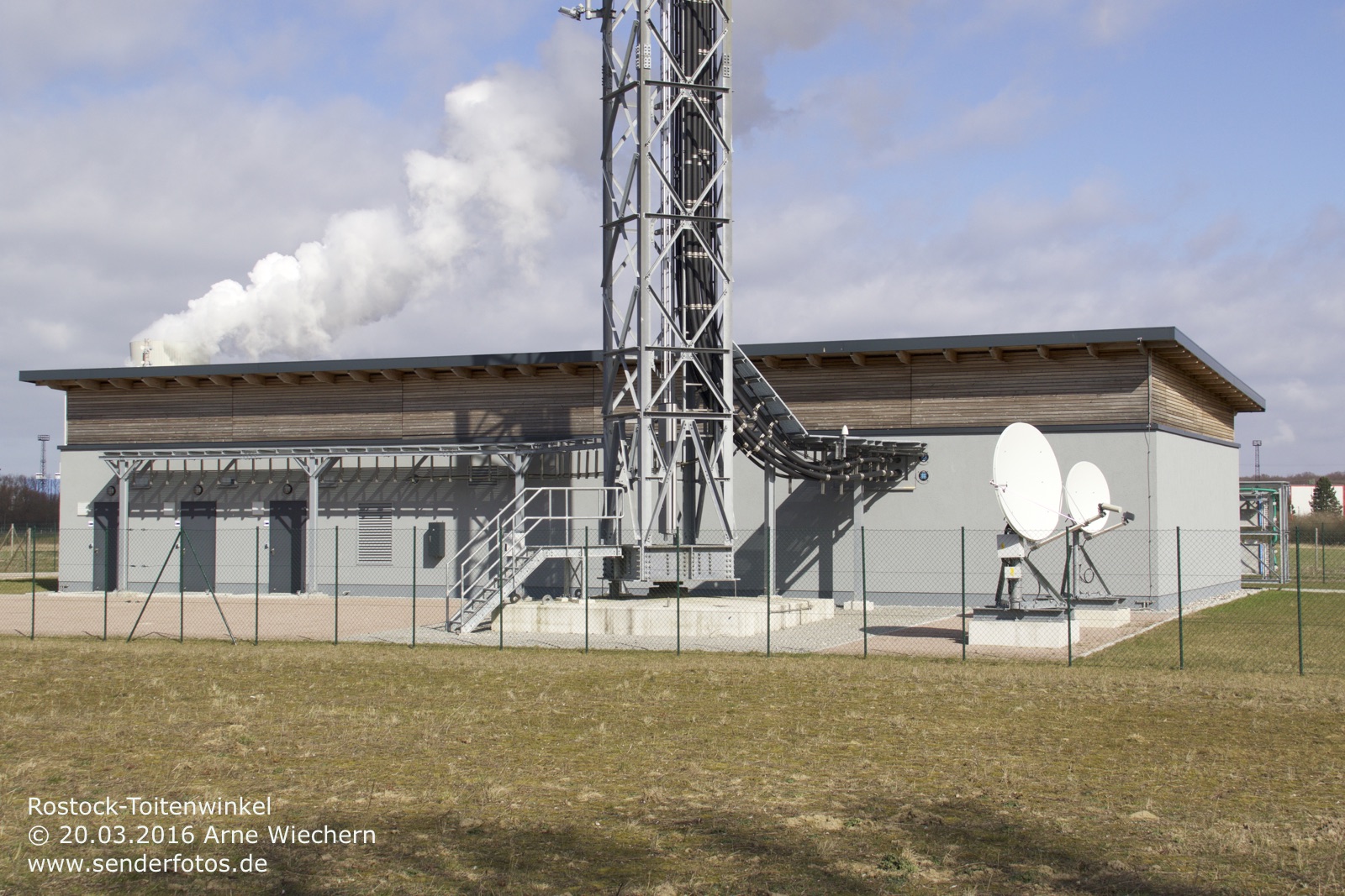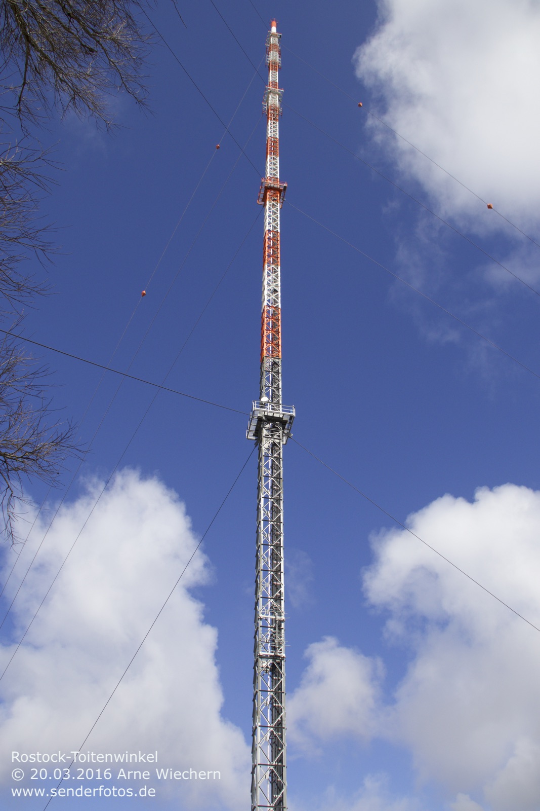 (DFMG) – 23.03.2014: Im Jahr 2012 war bekanntgeworden, dass ein neuer Sendemast in Rostock den bisherigen Sender Marlow ersetzen soll. Baubeginn auf einem Grundstück zwischen den Ortsteilen Toitenwinkel und Krummendorf war am 22. April 2013 – mit dem Aufbau des Stahlgittermasts wurde am 8. Oktober 2013 begonnen. Die Baukosten betrugen 2,6 Mio. Euro. Von diesem 245 m hohen Mast sollen künftig Hörfunkprogramme im UKW- und DAB plus-Bereich sowie Fernsehen im DVB-T-Modus abgestrahlt werden. UKW-Antennen sind auf zwei Ebenen (145 und 187 m) montiert, Die DAB-Antennen (225 m) befinden sich ebenso wie die DVB-T-Antennen (231 m) im GFK-Zylinder an der Spitze des Turms. Abgestrahlt werden künftig von der oberen Antenneneben: NDR Kultur (88,2 MHz/160 kW), NDR 1 Radio MV (91,0 MHz/100 kW), NDR 2 (93,5 MHz/40 kW), DeutschlandRadio Kultur (96,7 MHz/40 kW), Antenne MV (100,8 MHz/130 kW), NDR Info (102,8 MHz/100 kW) und Ostseewelle (104,8 MHz/100 kW). Die Sender für NDR Kultur (160 kW) und Antenne MV (130 kW) werden damit die leistungsstärksten UKW-Sender Deutschlands sein. Die untere Antennenebene nutzen: N-Joy (88,9 MHz/5 kW) und Lohro (90,2 MHz/0,1 kW). Außerdem sind für diese Ebene die Frequenzen 97,3 MHz (5 kW) und 105,6 MHz (0,2 kW) koordiniert. Im DVB-T-Bereich ist davon auszugehen, dass die beiden derzeit vom Fernsehturm Rostock-Stadtweide abgestrahlten Bouquets (NDR-MVP, Kanal 29, 1 kW und ZDFmobil, Kanal 46, 1 kW) nach Toitenwinkel umziehen werden.