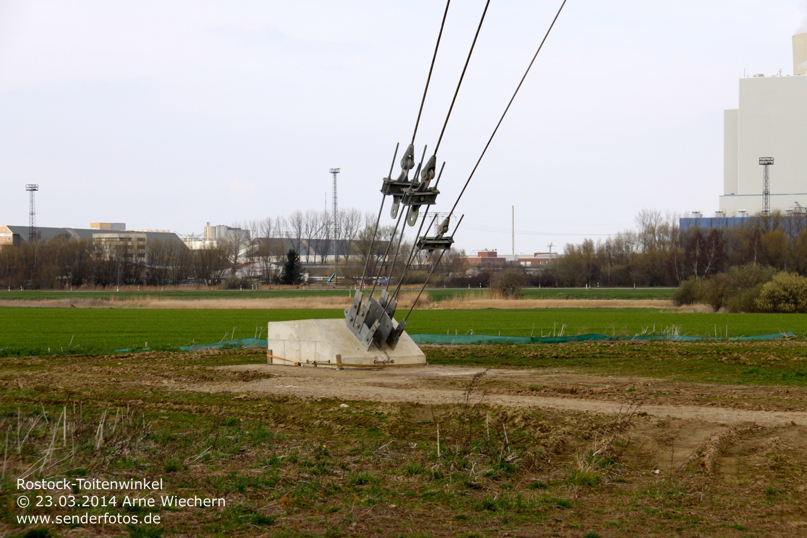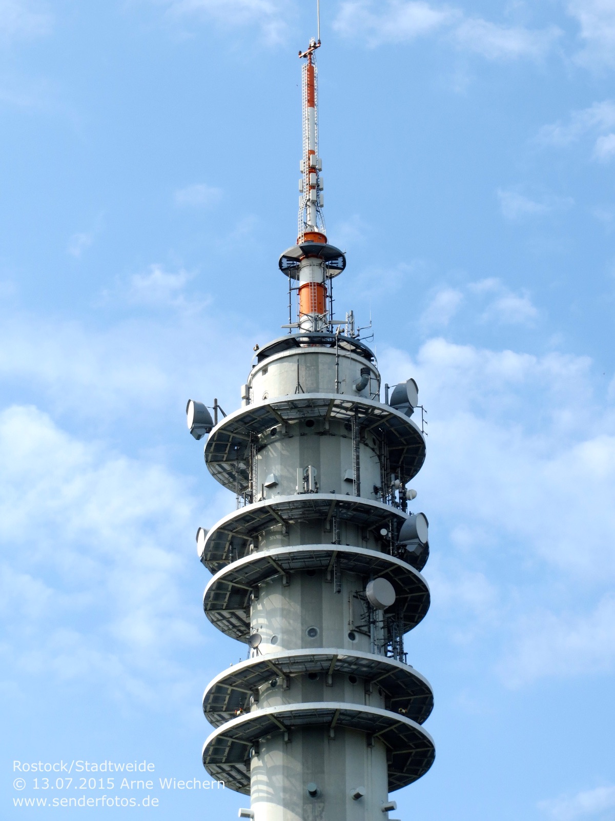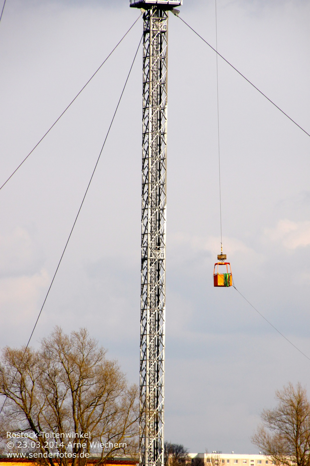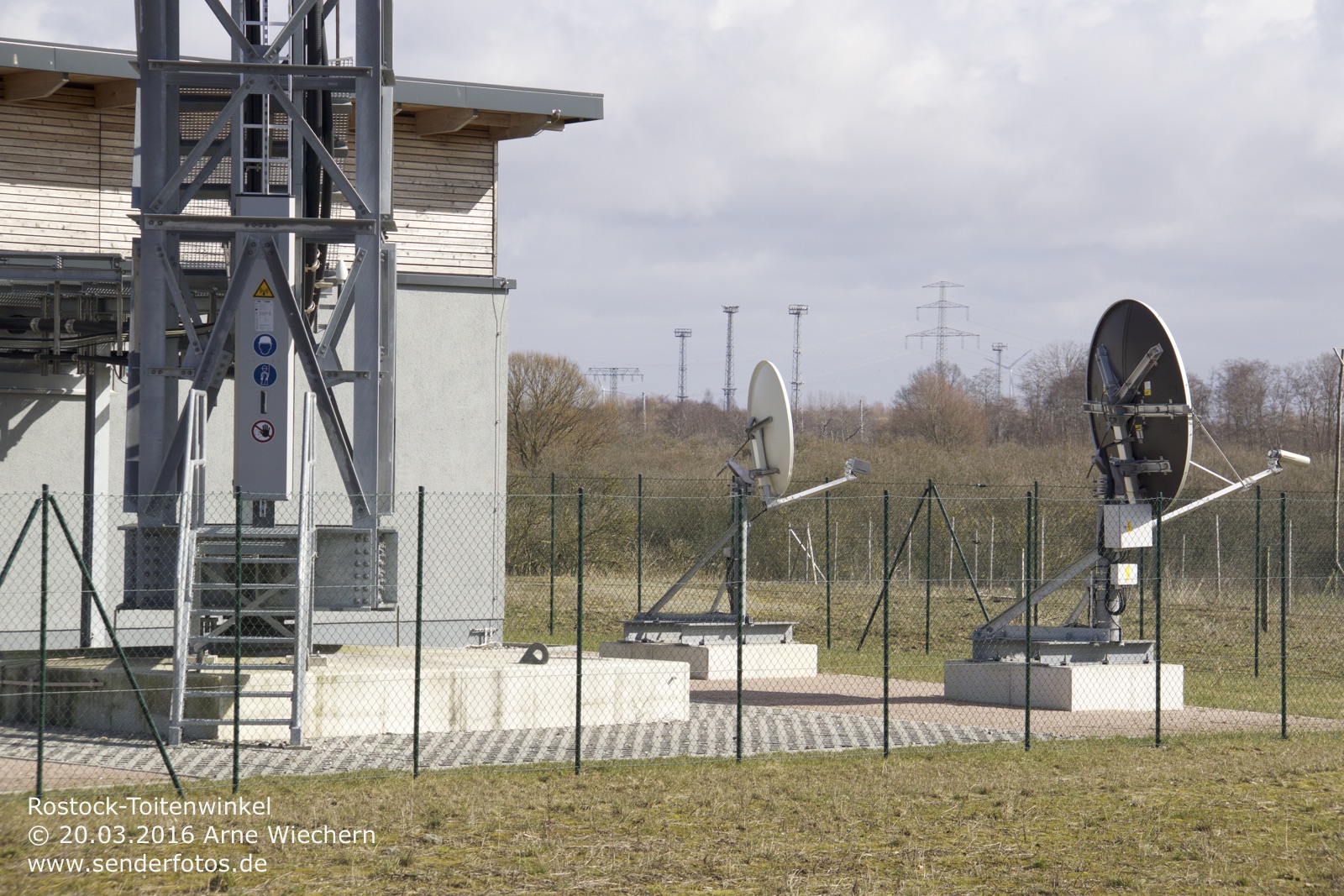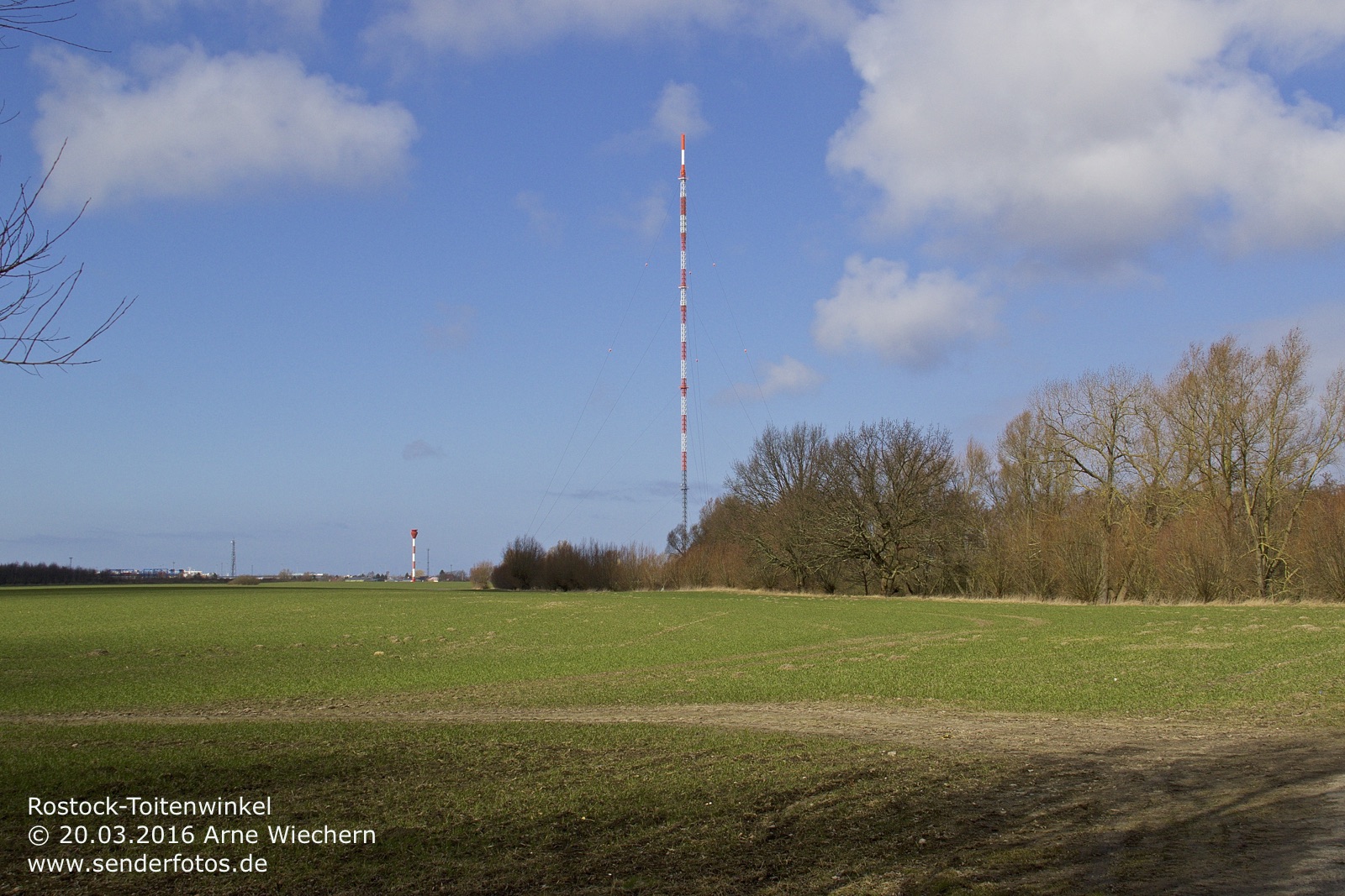 (DFMG) – 23.03.2014: Im Jahr 2012 war bekanntgeworden, dass ein neuer Sendemast in Rostock den bisherigen Sender Marlow ersetzen soll. Baubeginn auf einem Grundstück zwischen den Ortsteilen Toitenwinkel und Krummendorf war am 22. April 2013 – mit dem Aufbau des Stahlgittermasts wurde am 8. Oktober 2013 begonnen. Die Baukosten betrugen 2,6 Mio. Euro. Von diesem 245 m hohen Mast sollen künftig Hörfunkprogramme im UKW- und DAB plus-Bereich sowie Fernsehen im DVB-T-Modus abgestrahlt werden. UKW-Antennen sind auf zwei Ebenen (145 und 187 m) montiert, Die DAB-Antennen (225 m) befinden sich ebenso wie die DVB-T-Antennen (231 m) im GFK-Zylinder an der Spitze des Turms. Abgestrahlt werden künftig von der oberen Antenneneben: NDR Kultur (88,2 MHz/160 kW), NDR 1 Radio MV (91,0 MHz/100 kW), NDR 2 (93,5 MHz/40 kW), DeutschlandRadio Kultur (96,7 MHz/40 kW), Antenne MV (100,8 MHz/130 kW), NDR Info (102,8 MHz/100 kW) und Ostseewelle (104,8 MHz/100 kW). Die Sender für NDR Kultur (160 kW) und Antenne MV (130 kW) werden damit die leistungsstärksten UKW-Sender Deutschlands sein. Die untere Antennenebene nutzen: N-Joy (88,9 MHz/5 kW) und Lohro (90,2 MHz/0,1 kW). Außerdem sind für diese Ebene die Frequenzen 97,3 MHz (5 kW) und 105,6 MHz (0,2 kW) koordiniert. Im DVB-T-Bereich ist davon auszugehen, dass die beiden derzeit vom Fernsehturm Rostock-Stadtweide abgestrahlten Bouquets (NDR-MVP, Kanal 29, 1 kW und ZDFmobil, Kanal 46, 1 kW) nach Toitenwinkel umziehen werden.