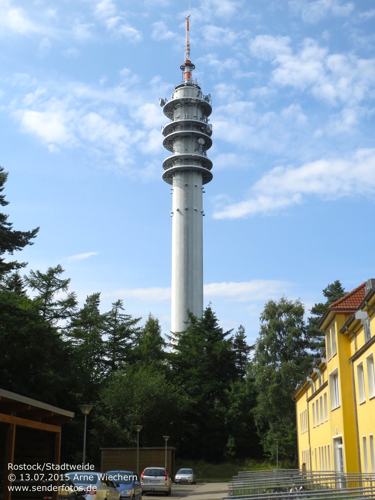 (DFMG Deutsche Funkturm GmbH) – 24.01.2013: Aus 120 m Höhe senden mit jeweils 2 kW N-Joy (88,9 MHz) und Antenne Mecklenburg-Vorpommern (97,3 MHz). In 85 m Höhe sind die Antennen für NDR 1 Radio MV (95,8 MHz / 160 Watt), Ostseewelle (105,6 MHz / 160 Watt) und LOHRO 107,9 (100 Watt) montiert. Für den DLF (106,5 MHz / 1 kW) befindet sich noch eine Antenne in 80 m Höhe. Im TV-Bereich senden im DVB-T-Verfahren heute das NDR Bouquet (Kanal 29) und das ZDF-Bouquet (Kanal 46). Beide haben eine Leistung von 1 kW. Update 2015: In der Nacht vom 4. auf den 5. August 2014 wurden sämtliche Sender am Standort Stadtweide stillgelegt – die Programme werden seitdem vom Sender Rostock/Toitenwinkel ausgestrahlt. Am Fernmeldeturm Stadtweide wurden die Sendeantennen anschließend demontiert.