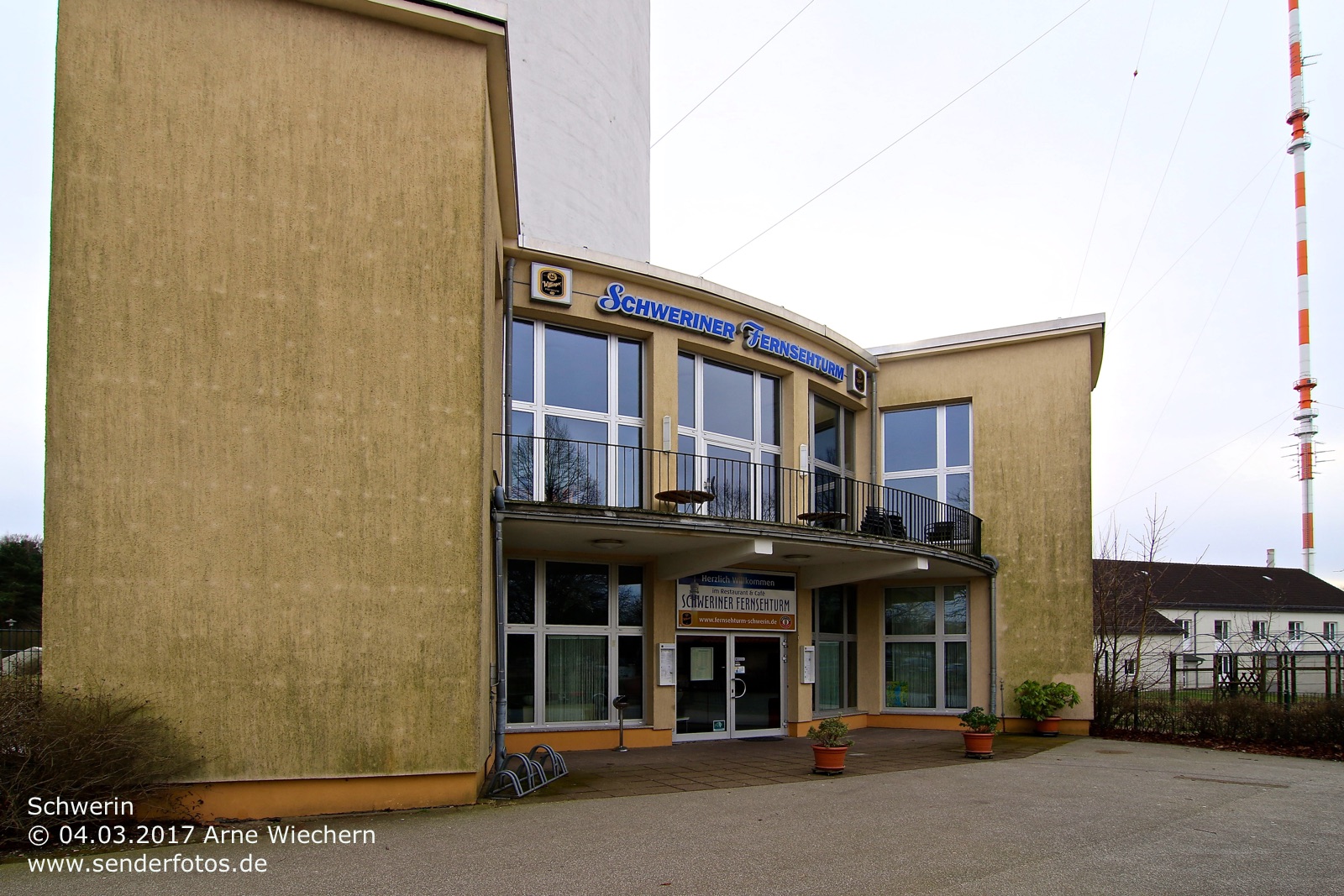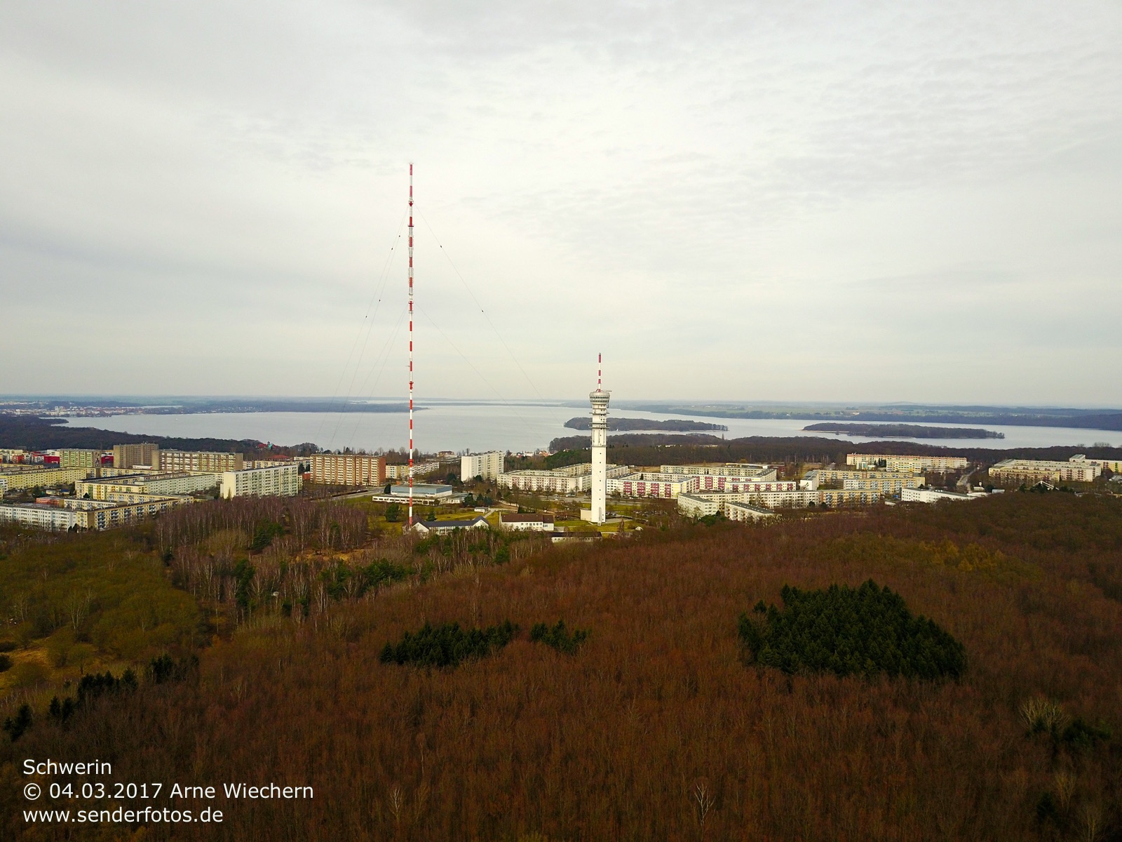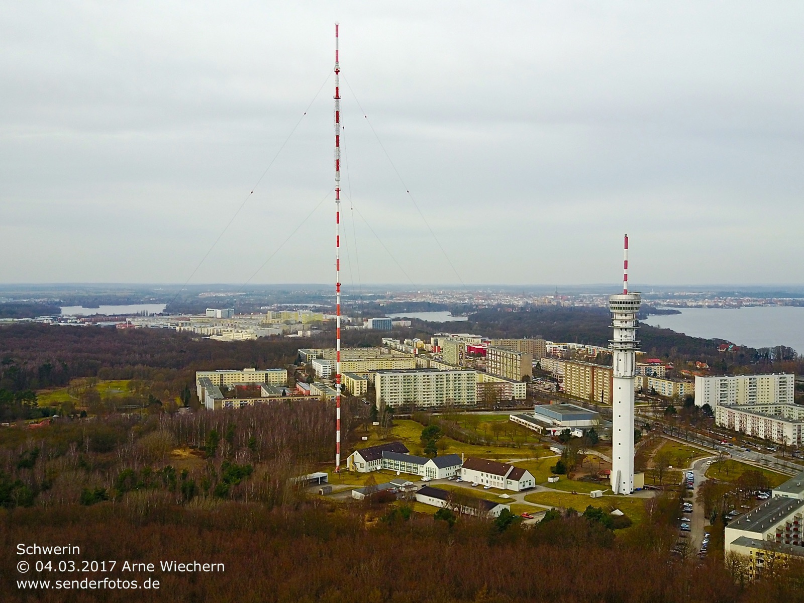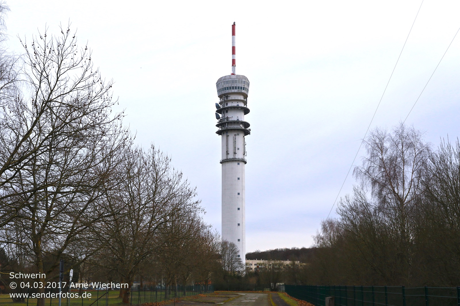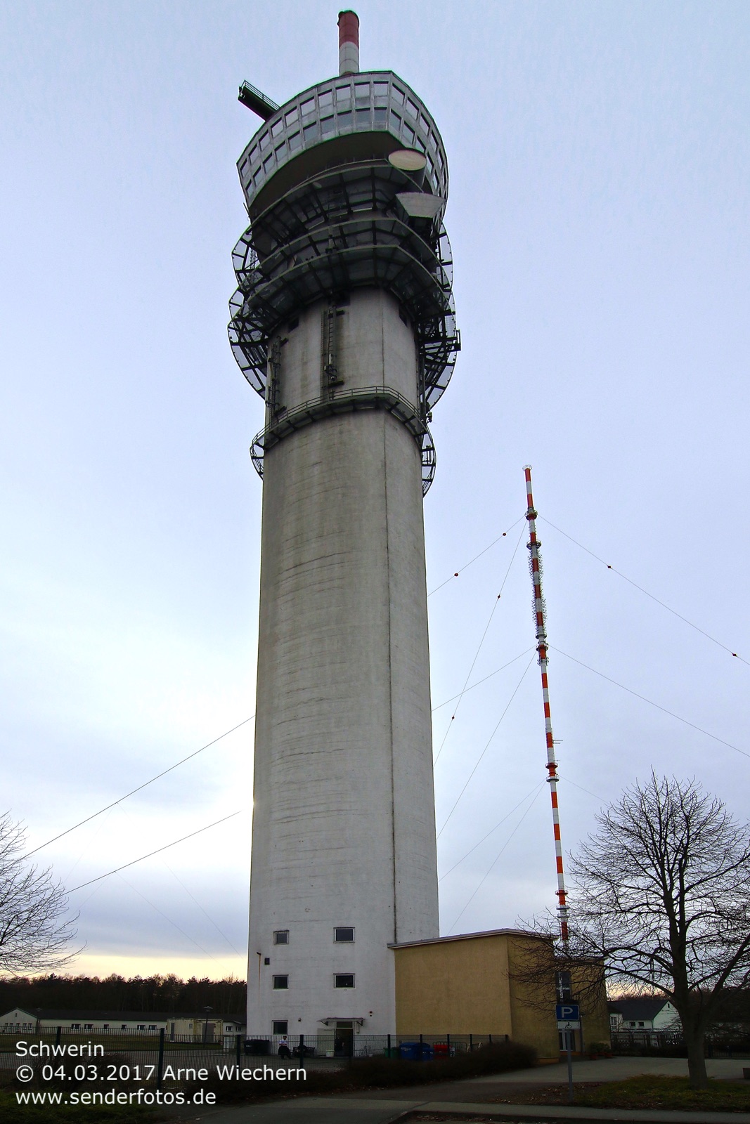 (DFMG Deutsche Funkturm GmbH) – 24.01.2013: Am Rand der Schweriner Plattenbausiedlung Neu-Zippendorf stehen sowohl der Fernsehturm aus den 60er Jahren mit 136 Metern Höhe als auch der Stahlrohrmast der Telekom mit einer Gesamthöhe von 273 Metern. Zur Abstrahlung der Radio- und TV-Programme dient heute ausschließlich der Stahlrohrmast. Am Fernsehturm sind noch Richtfunkantennen montiert. Der GFK-Zylinder an der Spitze ist funktionslos. Sehr zu empfehlen ist das Cafe auf 100 Metern sowie die Aussichtskanzel in 97 Metern Höhe. Beide Etagen sind per Fahrstuhl zu erreichen.