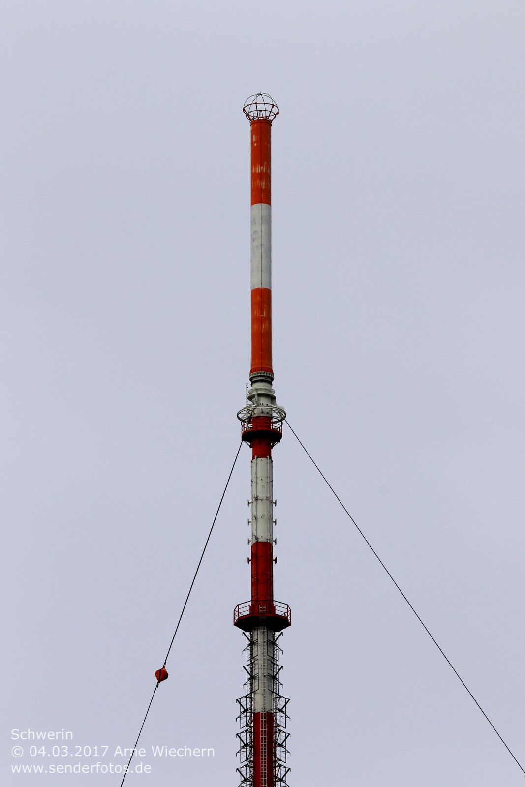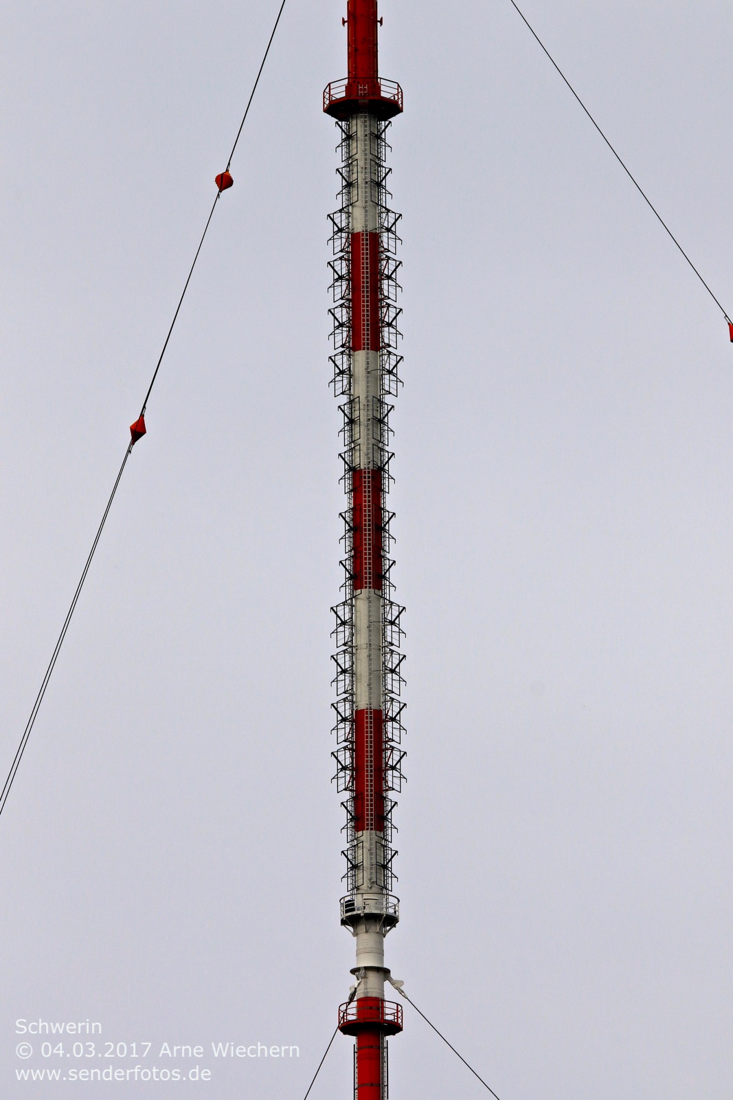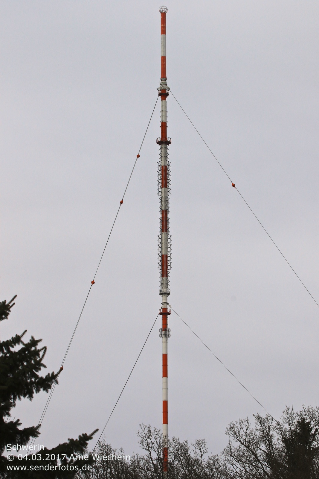 (DFMG Deutsche Funkturm GmbH) – 24.01.2013: In einer Höhe von 85 m sind Antennen für den Deutschlandfunk (91,3 MHz), die Ostseewelle (93,0 MHz) und Antenne MV (98,3 MHz) montiert. Alle Sender haben eine Leistung von 200 W.