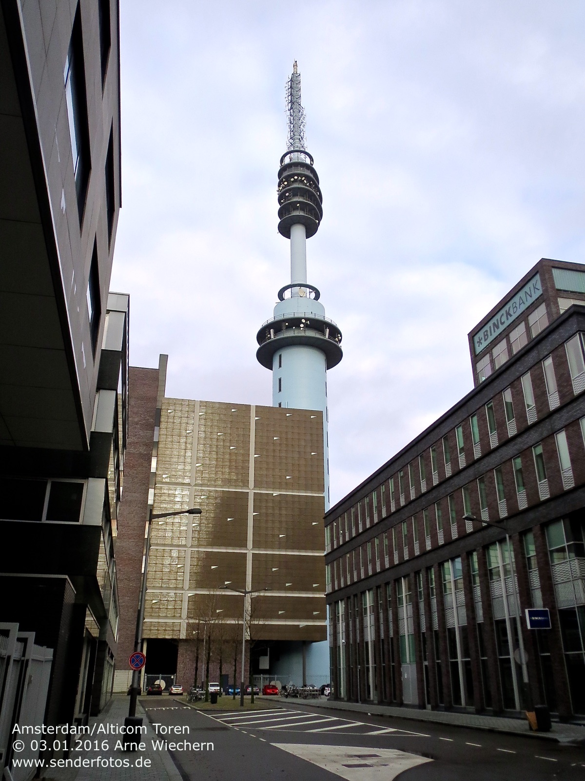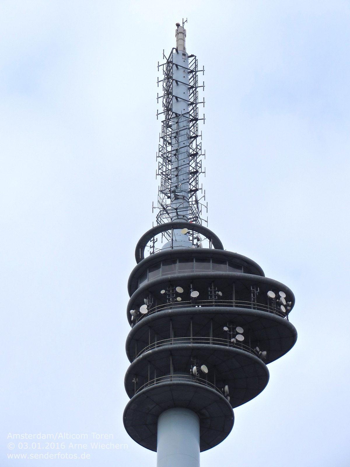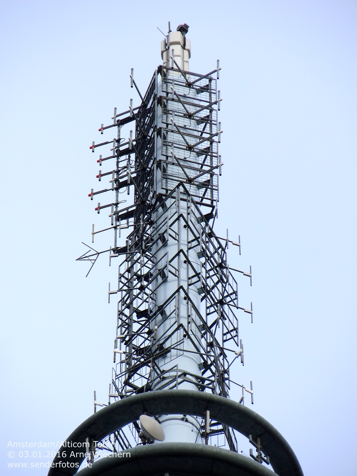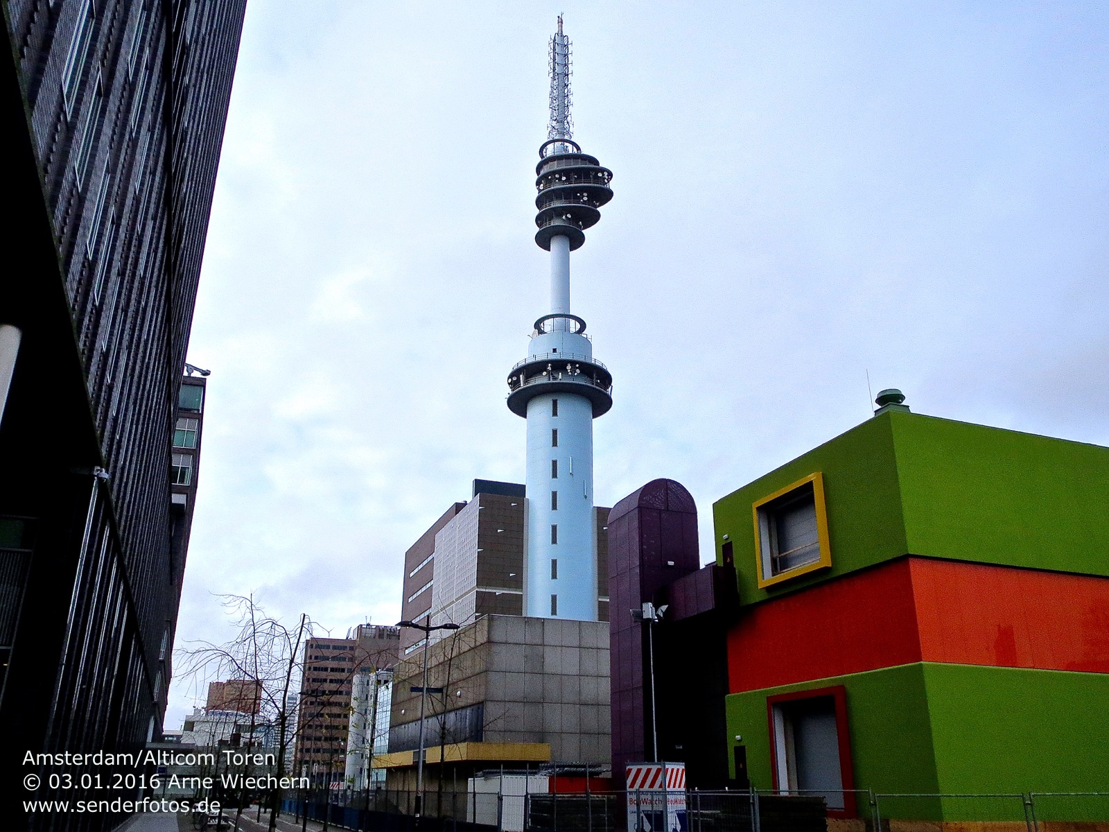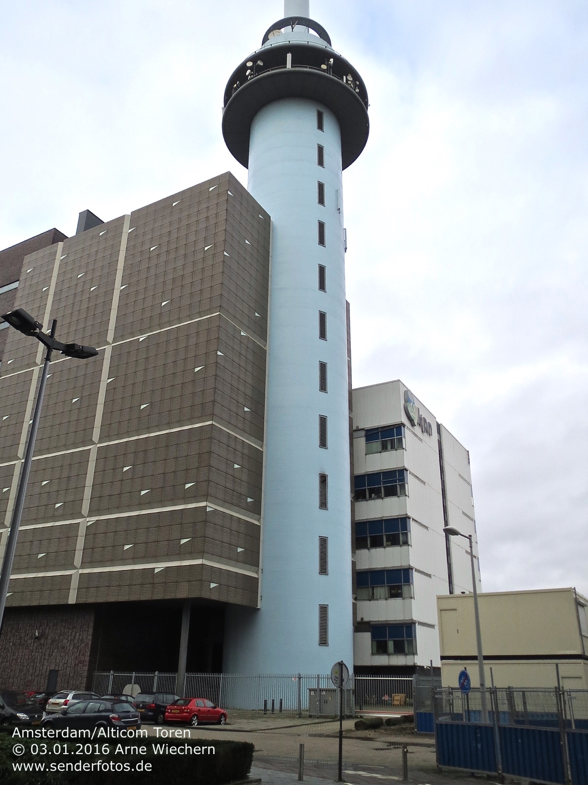 03.02.2016: Der Alticom Toren in Amsterdam in der Nähe des Messegeländes RAI ist der zentrale Standort der Stadt für Hörfunk- und TV-Ausstrahlungen. Auf UKW sind folgende Programme auf Sendung: