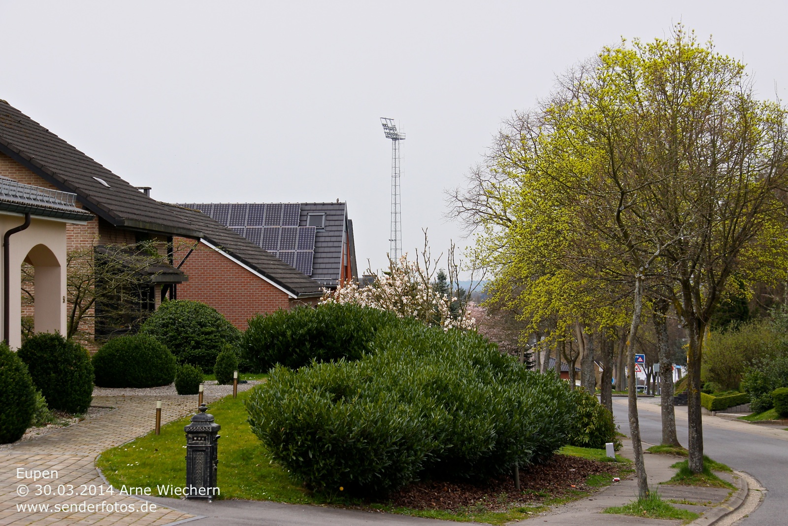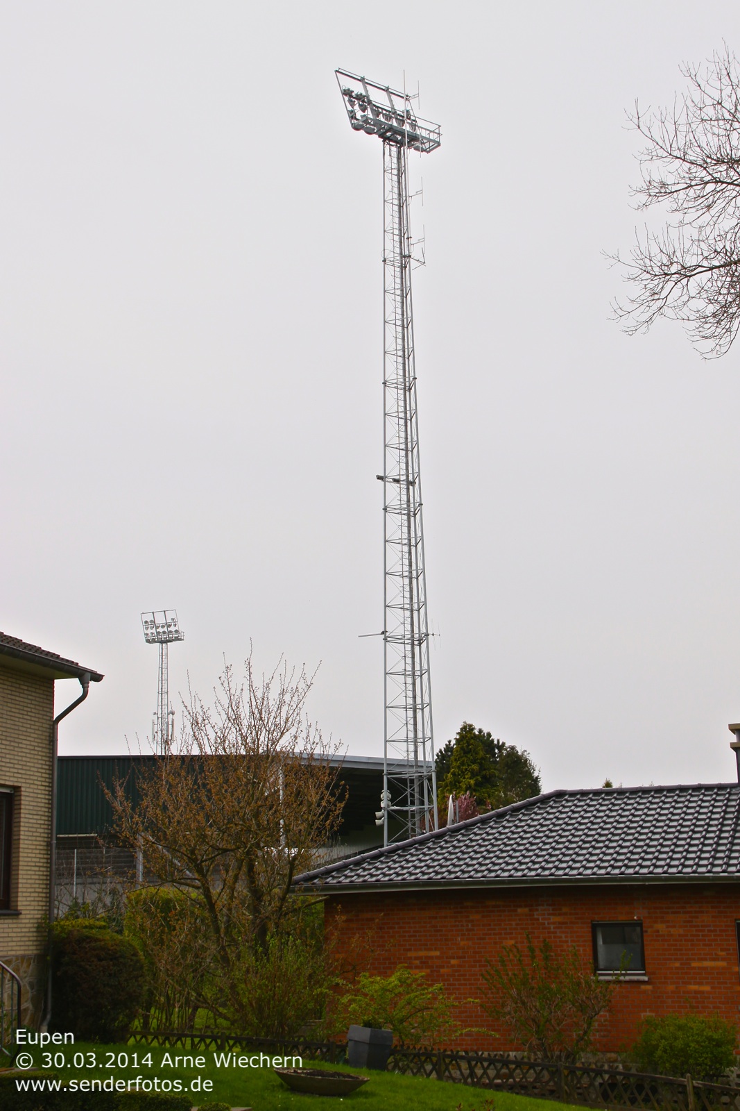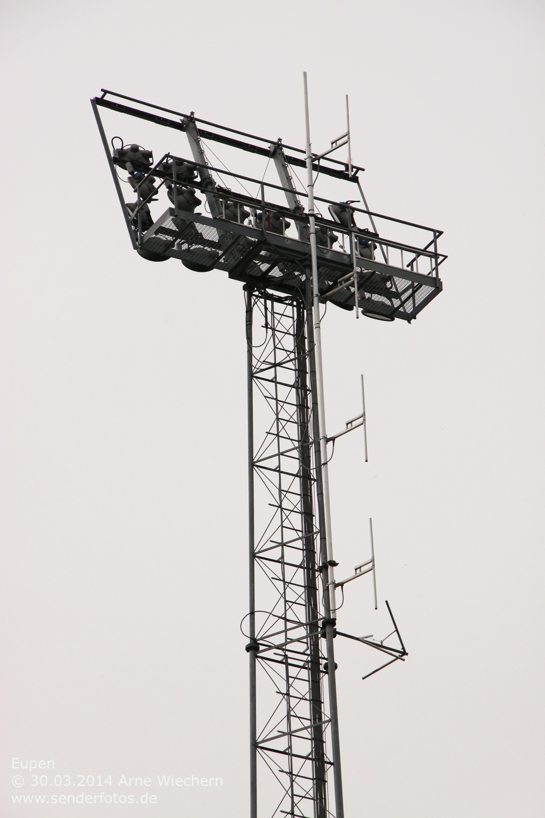 02.04.2014: Über die Antennen, die an einem der Flutlicht-Masten des Eupener Sportplatzes montiert sind, werden insgesamt drei Radioprogramme ausgestrahlt. Die vertikalen Dipole verwenden La Premiére (87,6 MHz/0,02 kW) und BRF 2 (98,4 MHz/1 kW). Über die Antenne für „zirkulare Polarisation“ sendet BRF 1 (94,9 MHz/0,05 kW). Entgegen ersten Informationen wird Radio 700 (101,2 kW/5 kW) nicht vom hier abgebildeten Mast abgestrahlt. Der Sender nutzt einen gegenüberliegenden Flutlichtmast dieses Sportplatzes als Antennenträger.