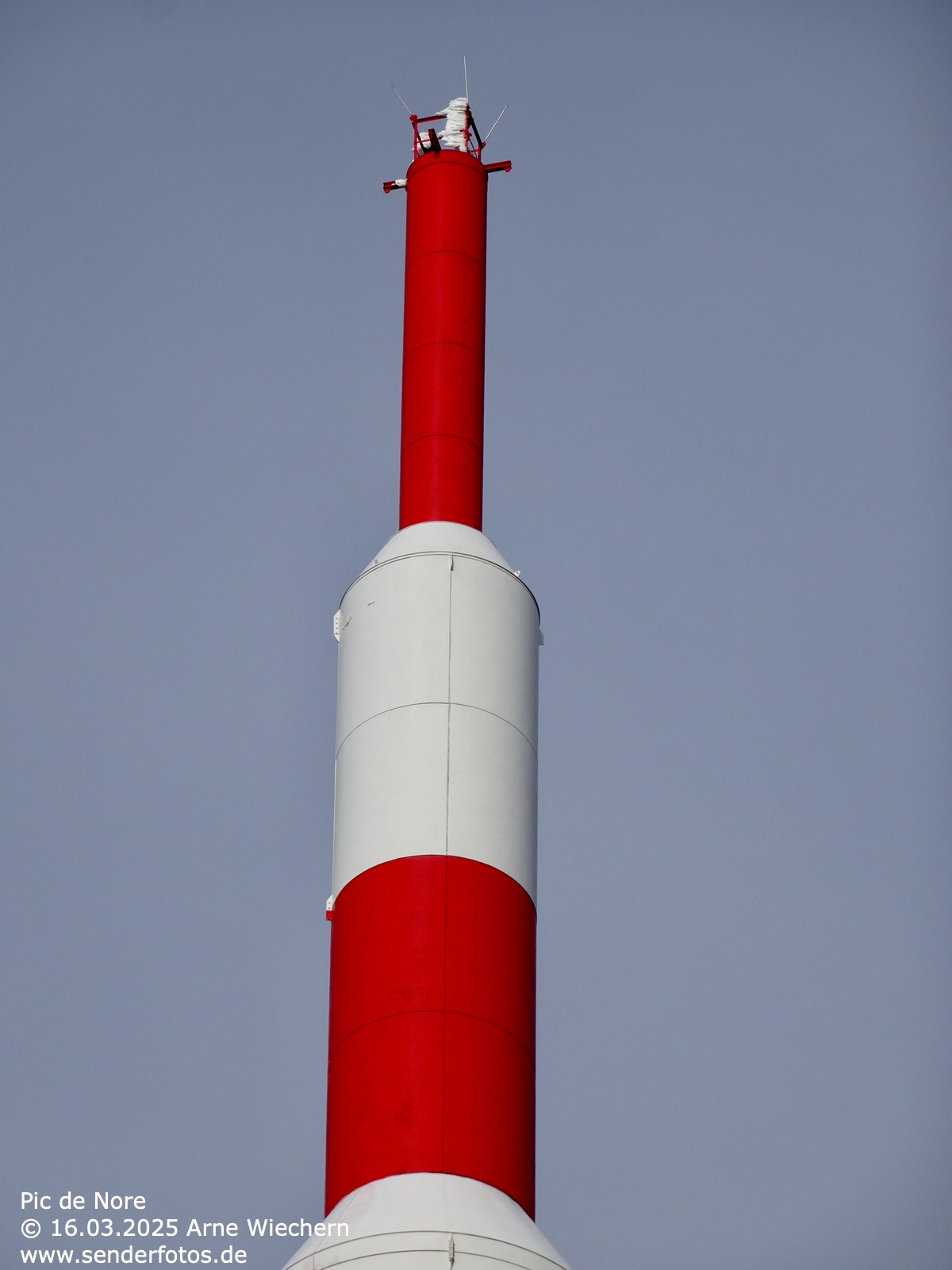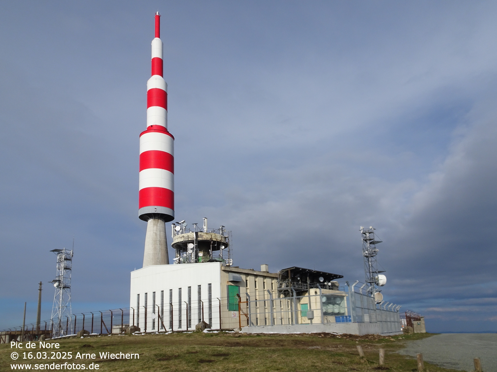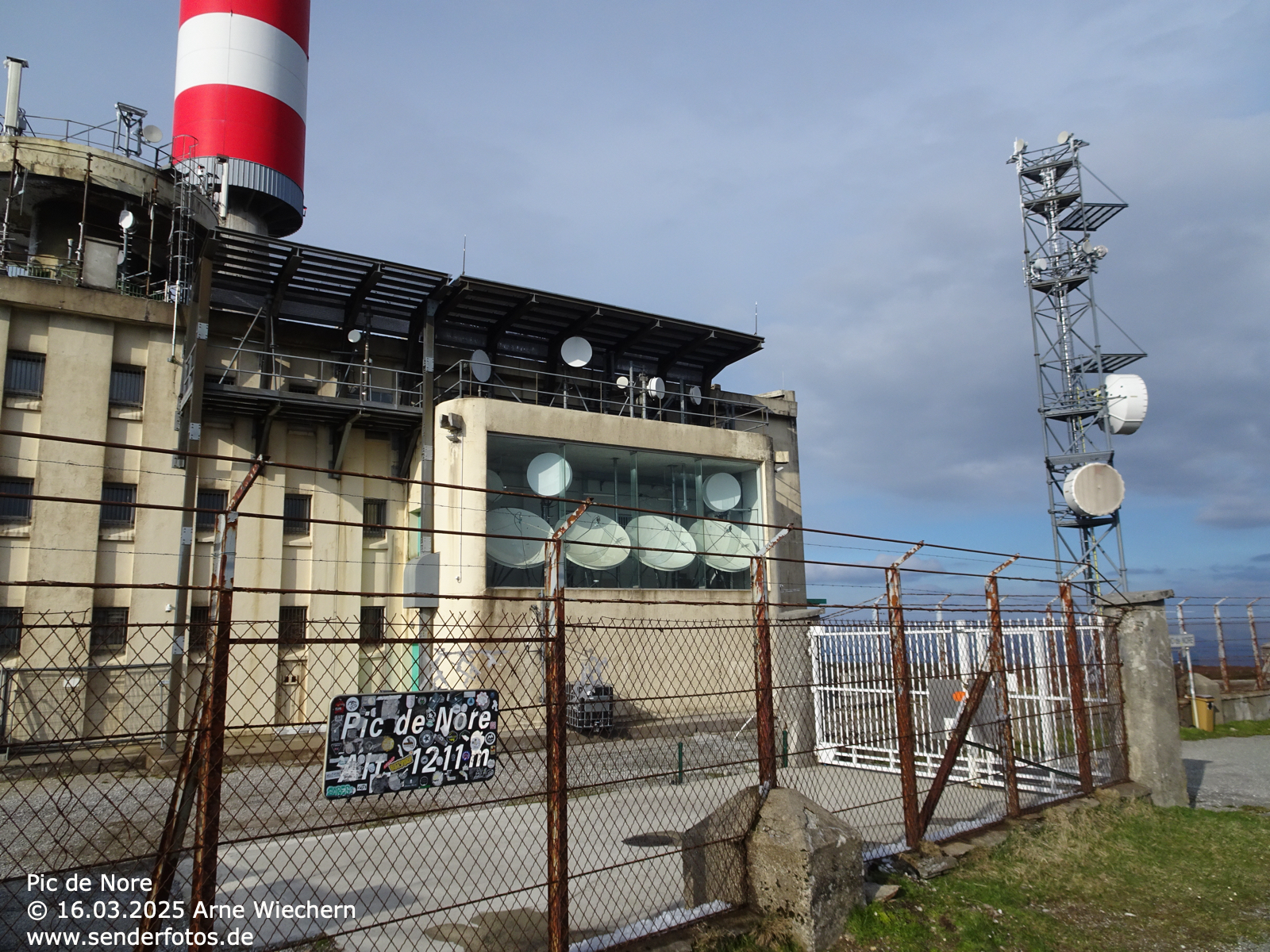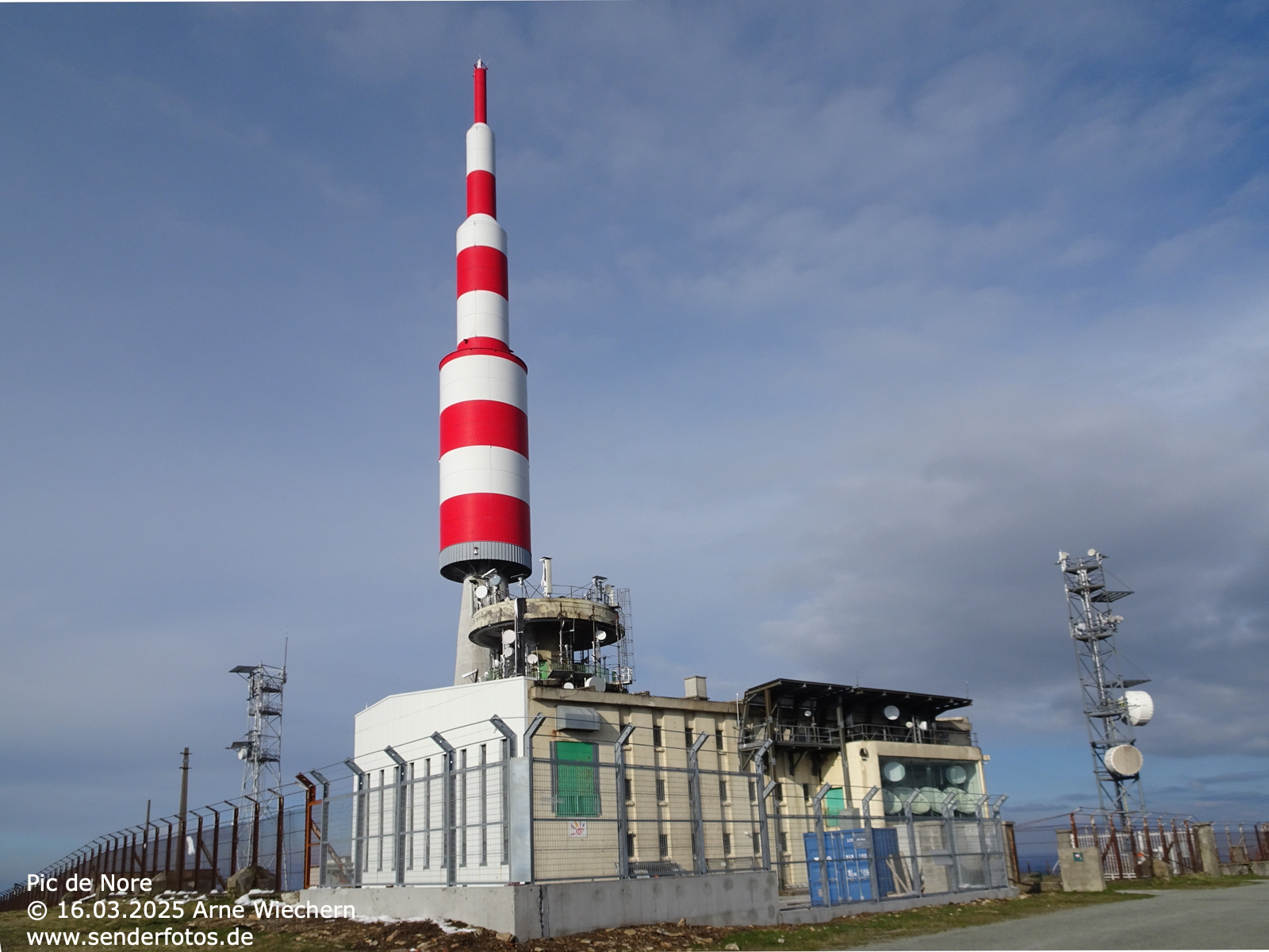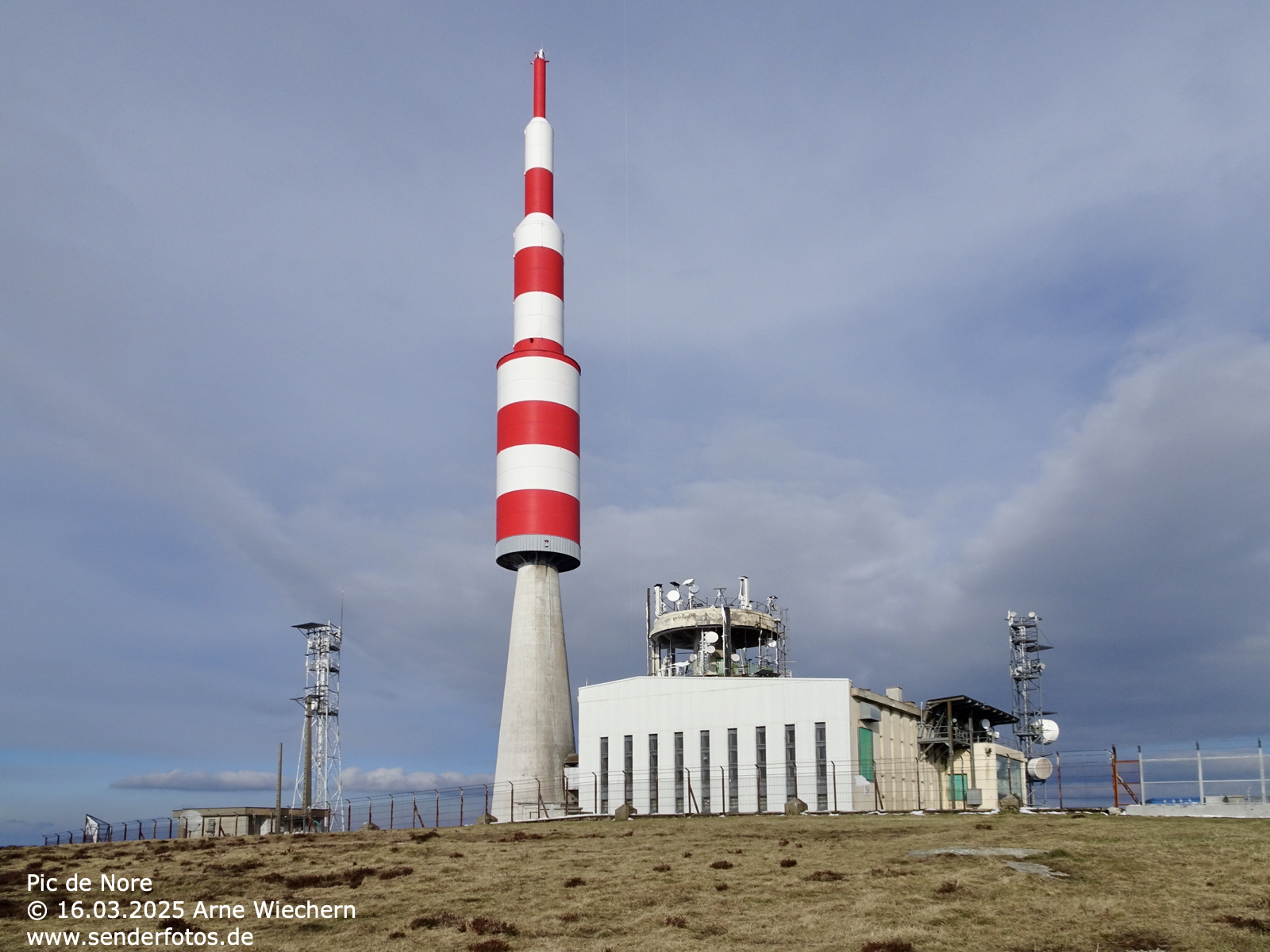 (TDF) – 17.03.2025: Die Sendeanlage auf dem Pic de Nore befindet sich in einer Höhenlage von 1210 m auf dem Gemeindegebiet Pradelles-Cabardès. Als Antennenträger dient ein 102 m hoher Stahlbetonturm, der 1976 errichtet wurde. Sein Vorgängerbau war in Folge eines Sturmes eingestürzt. Dieser Vorgängerturm war im Gegensatz zum aktuellen Antennenträger direkt auf dem Dach des Sendergebäudes montiert. Sein Stumpf wird noch heute als Plattform für eine Vielzahl kleinerer Antennen genutzt. Die Sendeantennen selbst sind jedoch am großen Stahlbetonturm montiert und zum Schutz vor Vereisung komplett mit GFK-Verschalungen verkleidet.