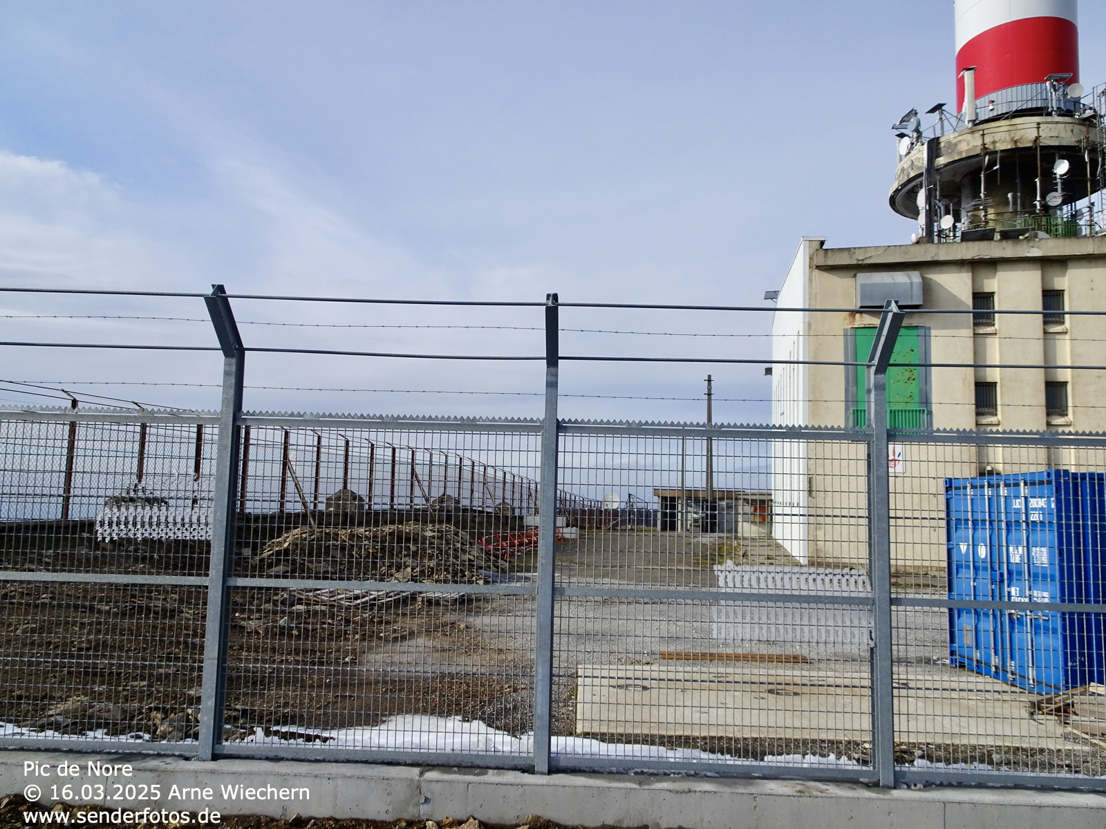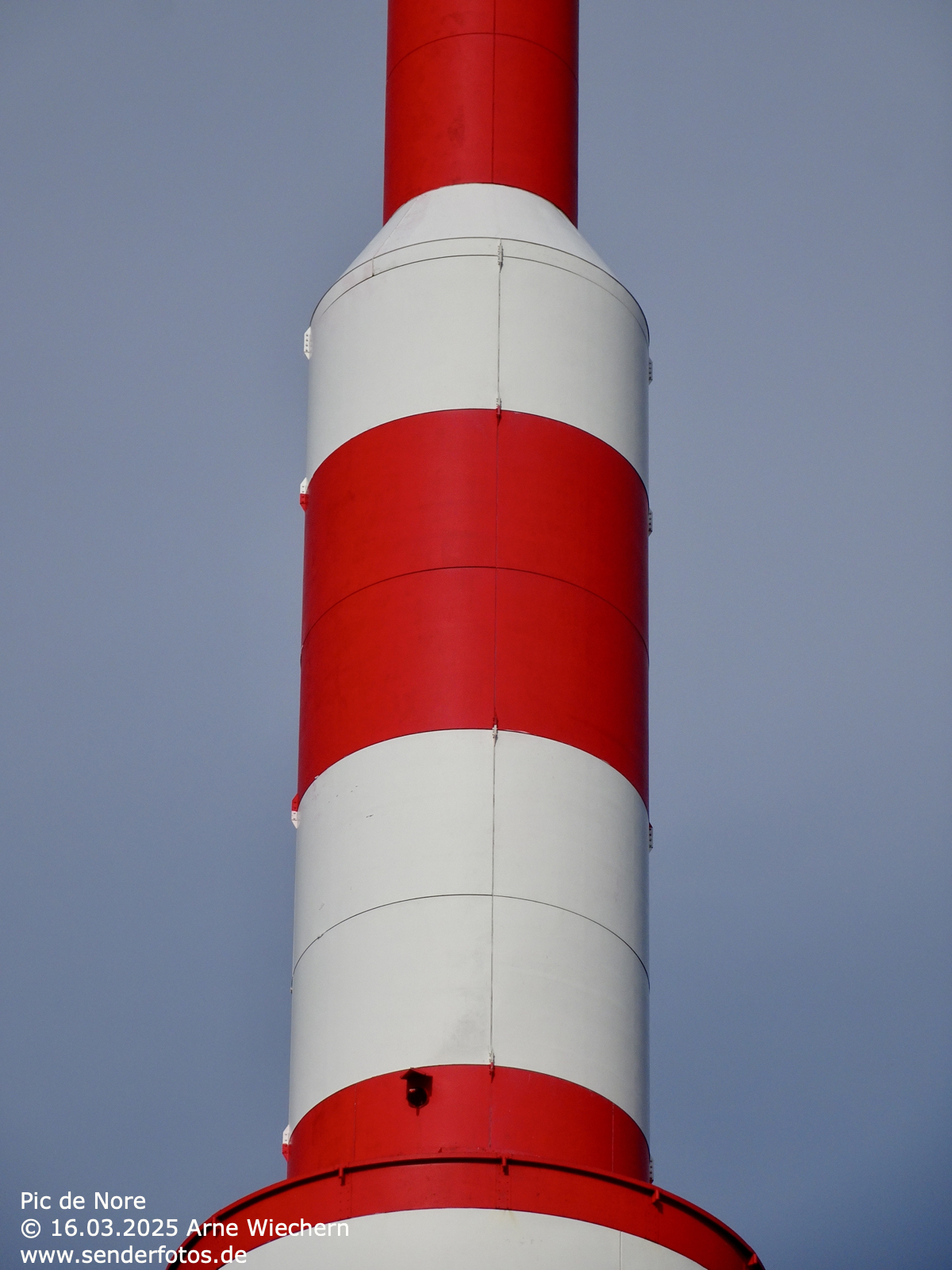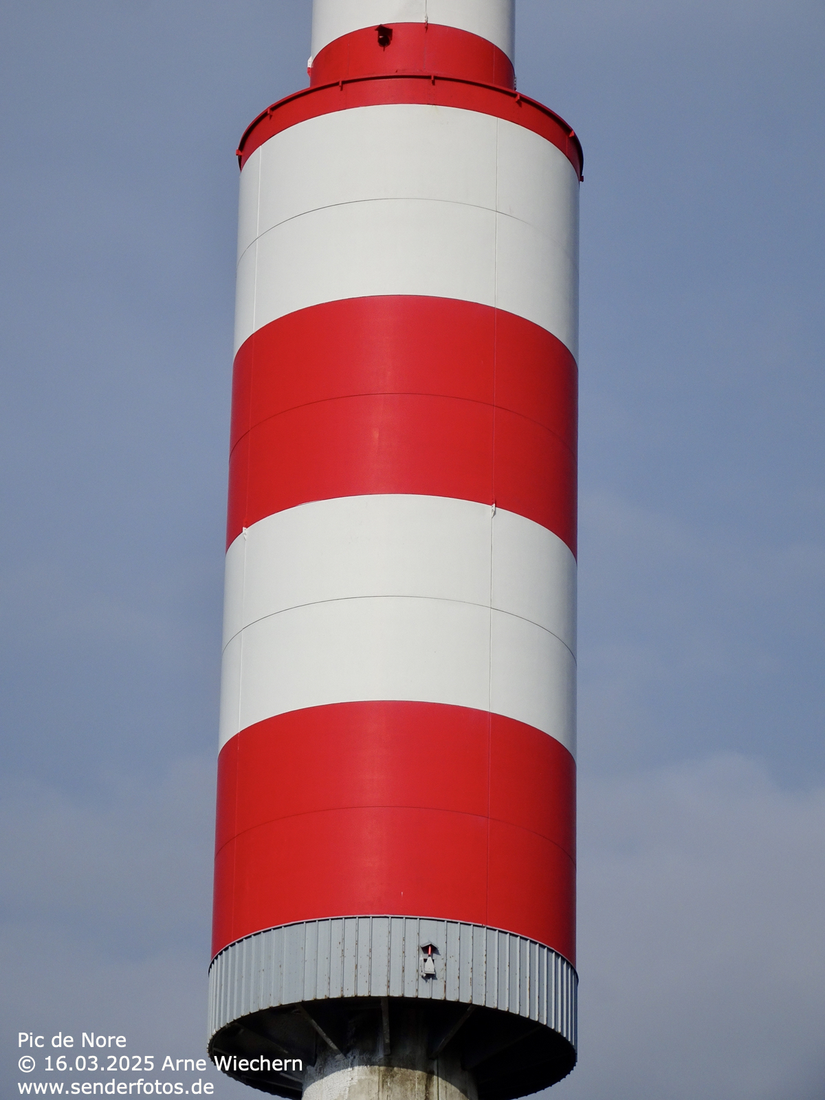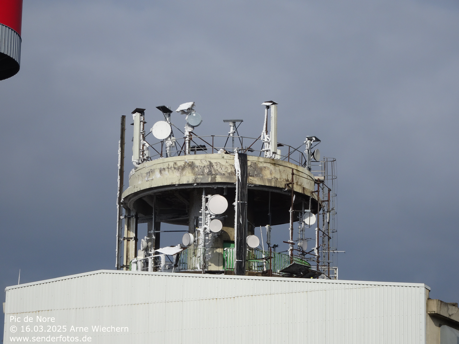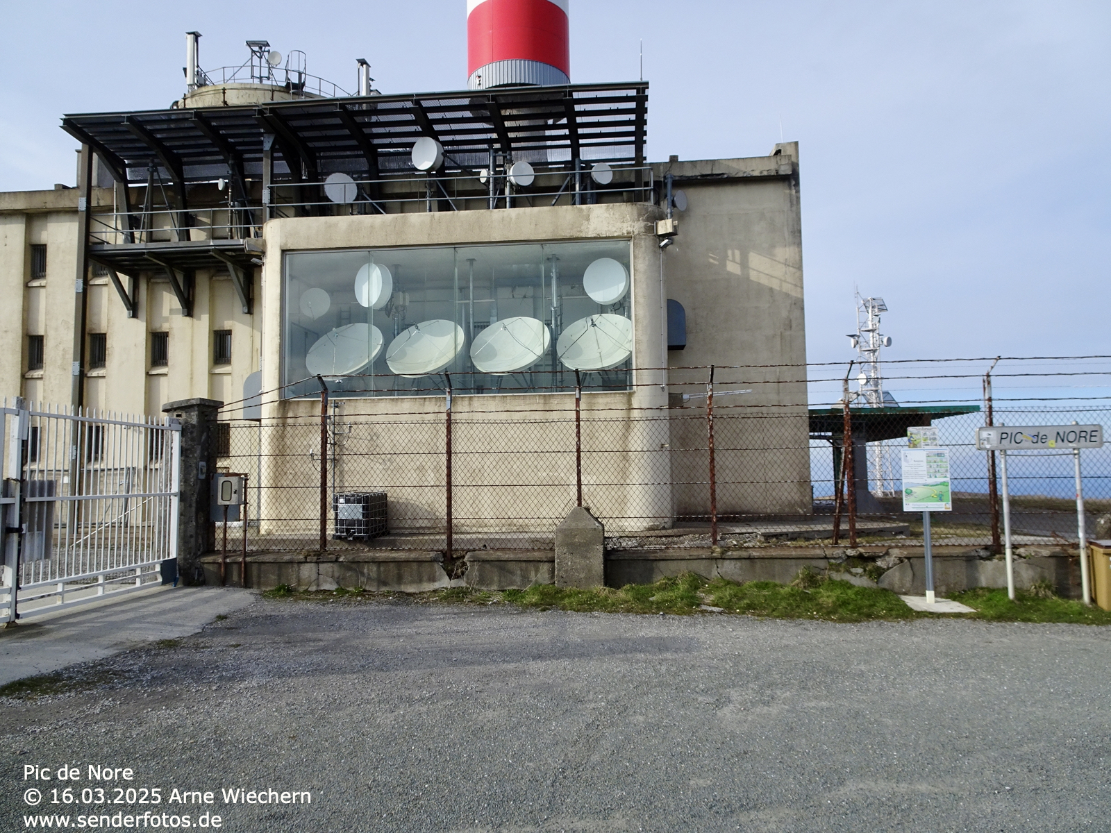 (TDF) – 17.03.2025: Die Sendeanlage auf dem Pic de Nore befindet sich in einer Höhenlage von 1210 m auf dem Gemeindegebiet Pradelles-Cabardès. Als Antennenträger dient ein 102 m hoher Stahlbetonturm, der 1976 errichtet wurde. Sein Vorgängerbau war in Folge eines Sturmes eingestürzt. Dieser Vorgängerturm war im Gegensatz zum aktuellen Antennenträger direkt auf dem Dach des Sendergebäudes montiert. Sein Stumpf wird noch heute als Plattform für eine Vielzahl kleinerer Antennen genutzt. Die Sendeantennen selbst sind jedoch am großen Stahlbetonturm montiert und zum Schutz vor Vereisung komplett mit GFK-Verschalungen verkleidet.