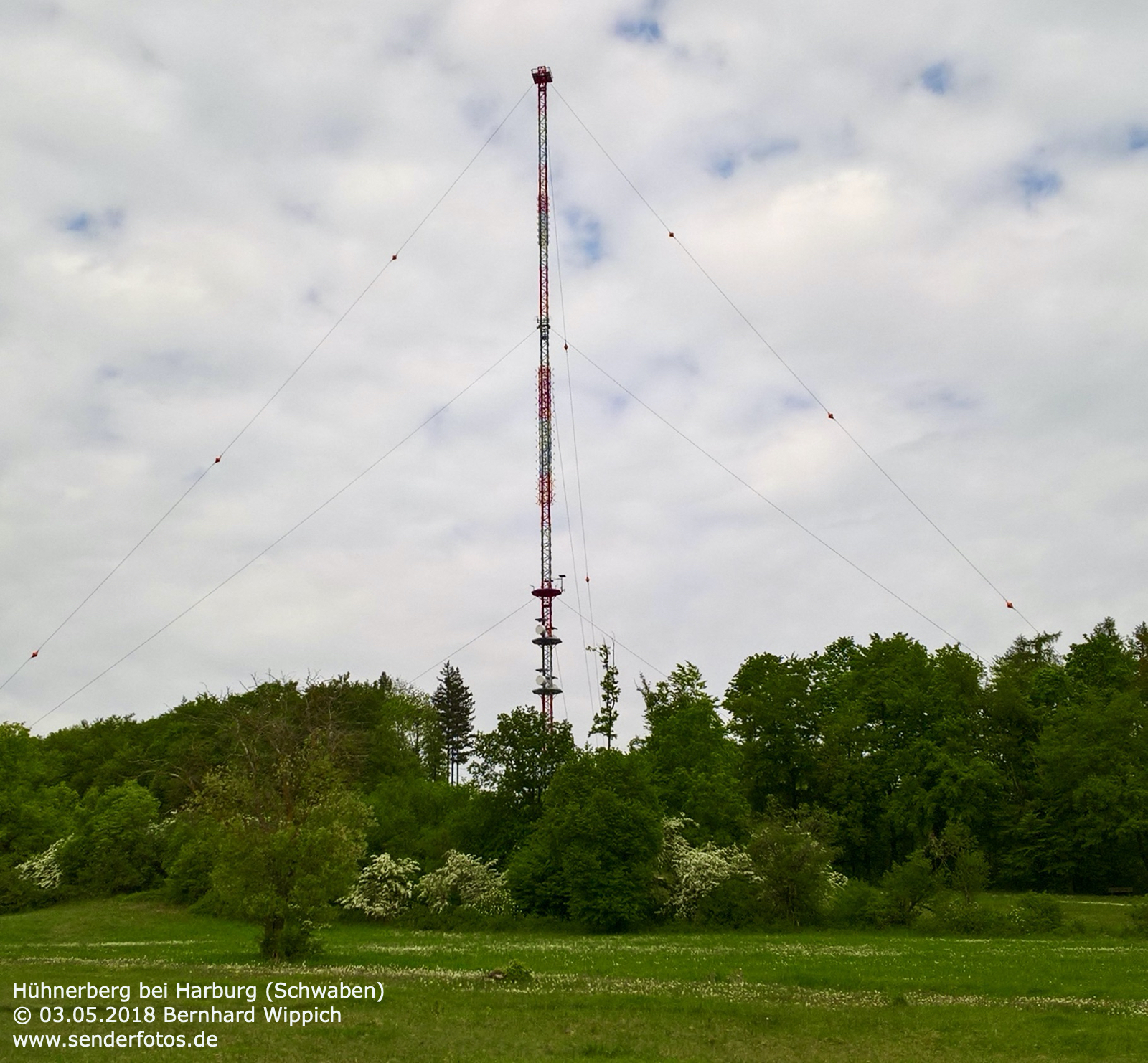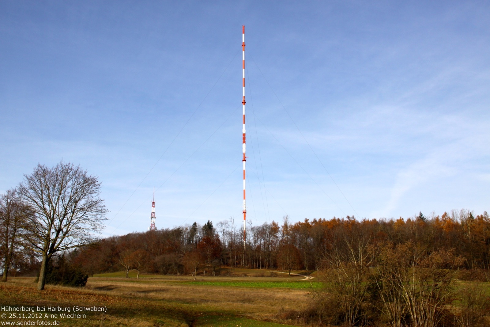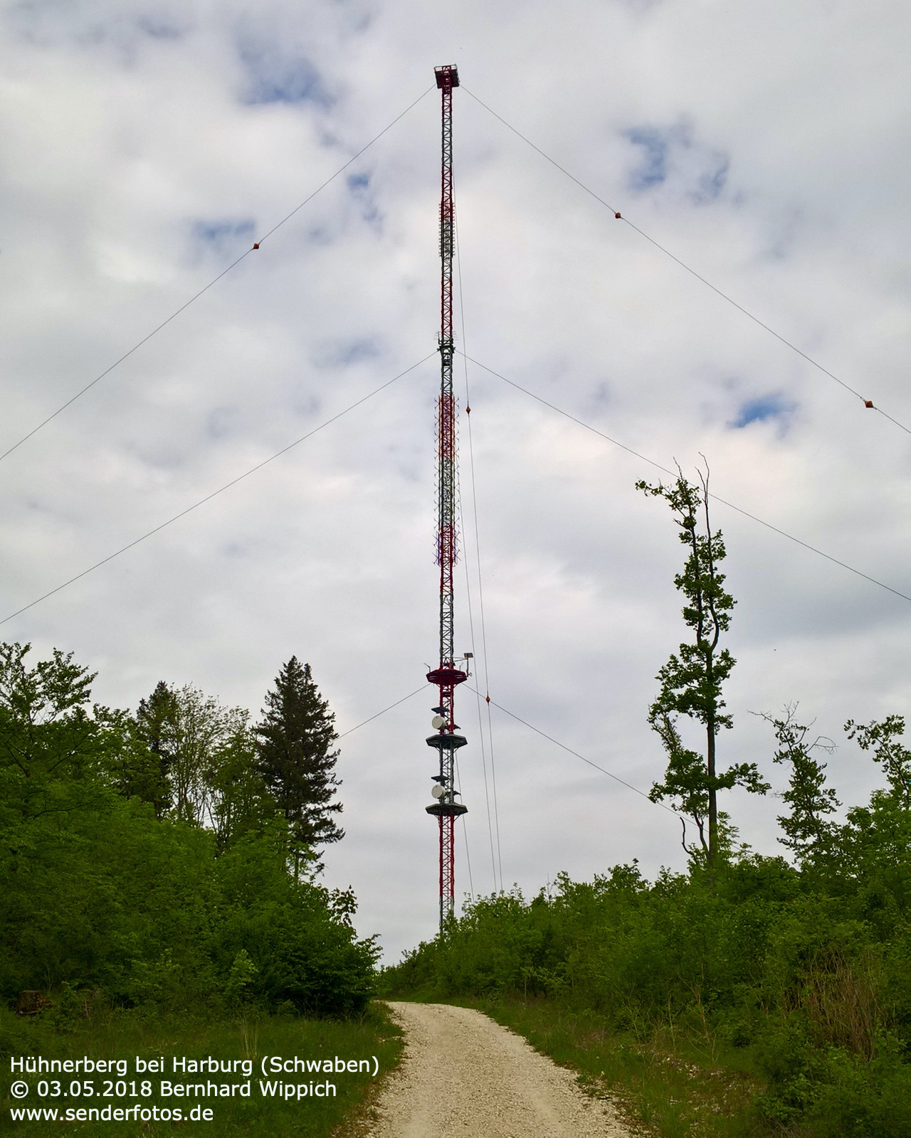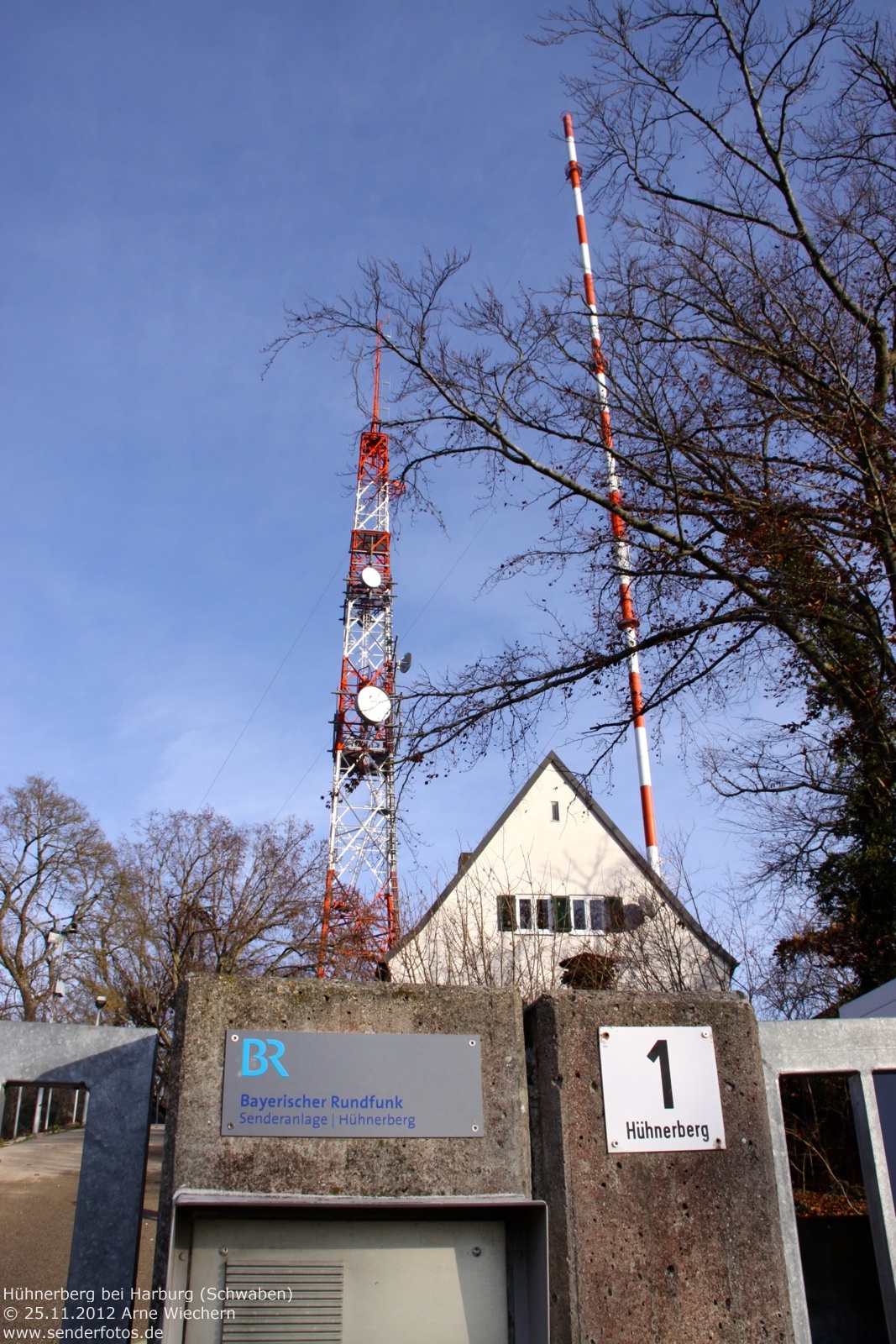 (BR) 25.11.2012: Bereits seit 1952 befinden sich Sendeanlagen des Bayerischen Rundfunks auf dem 570 m hohen Hühnerberg. Von 1952 bis 1965 diente hierzu ein 49 m hoher Stahlfachwerkturm, der heute noch für Richtfunk verwendet wird. Zur Ausstrahlung von Hörfunk und Fernsehen wurde seit 1965 ein 212 m hoher Stahlrohrmast eingesetzt. Die TV-Ausstrahlung der ARD (Kanal 60 / 400 kW) endete im November 2008 mit Inbetriebnahme von DVB-T in dieser Region. Der GFK-Zylinder an der Mastspitze ist seitdem ohne Funktion. Hörfunk wird jedoch weiterhin ausgestrahlt: Bayern 1 (91,9 MHz / 25 kW), Bayern 2 (96,1 MHz / 25 kW), Bayern 3 (99,5 MHz / 25 kW), Bayern Klassik (93,1 MHz / 10 kW), B 5 aktuell (107,6 MHz/11 kW) und hitradio.rt1 Nordschwaben (95,6 MHz / 1 kW). Zudem wird das bayerische DAB+-Paket auf Kanal 12 D (1 kW) ausgestrahlt. 02.04.2014: Am 1. April 2014 ist der bisherige 212 m hohe Stahlrohrmast gesprengt werden. Bis zum September 2014 soll am selben Standort ein neuer Mast entstehen, der dann auch in der Lage ist, neue Antennen für Digitalradio zu tragen. Dazu wäre der alte Mast nach Auskunft des BR aus statischen Gründen nicht mehr in der Lage gewesen. In der Übergangszeit dient ein 85 m hoher Kran als provisorischer Antennenträger. Die Sendeleistung bleibt auf den am Kranausleger montierten Antennen unverändert. Durch die etwas verringerte Höhe im Vergleich zum Stahlrohrmast kann es in den Randbereichen des Versorgungsgebietes allerdings zu Einschränkungen kommen. 15.05.2020: Die Bilder aus dem Jahr 2018 zeigen den neuen Stahlgittermast, der den Stahlrohrmast ersetzt hat. Im DAB+-Modus wird das Bayern-Multiplex des Bayerischen Rundfunks heute auf Kanal 11D mit 10 kW ausgestrahlt. Hinzu kommen die Multiplexe Obb/Schwaben (Kanal 10A/10 kW) und Augsburg (Kanal 9C/10 kW). Die Leistung des UKW-Senders für B5 aktuell (107,6 MHz) hat sich geändert. Das Programm wird heute mit 20 kW statt mit 11 kW ausgestrahlt.