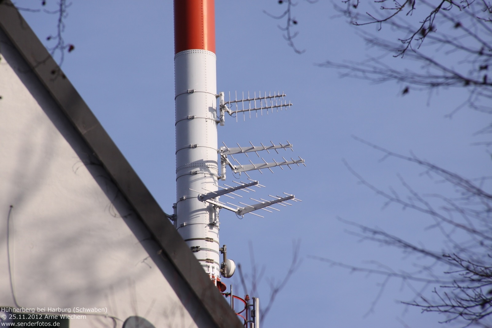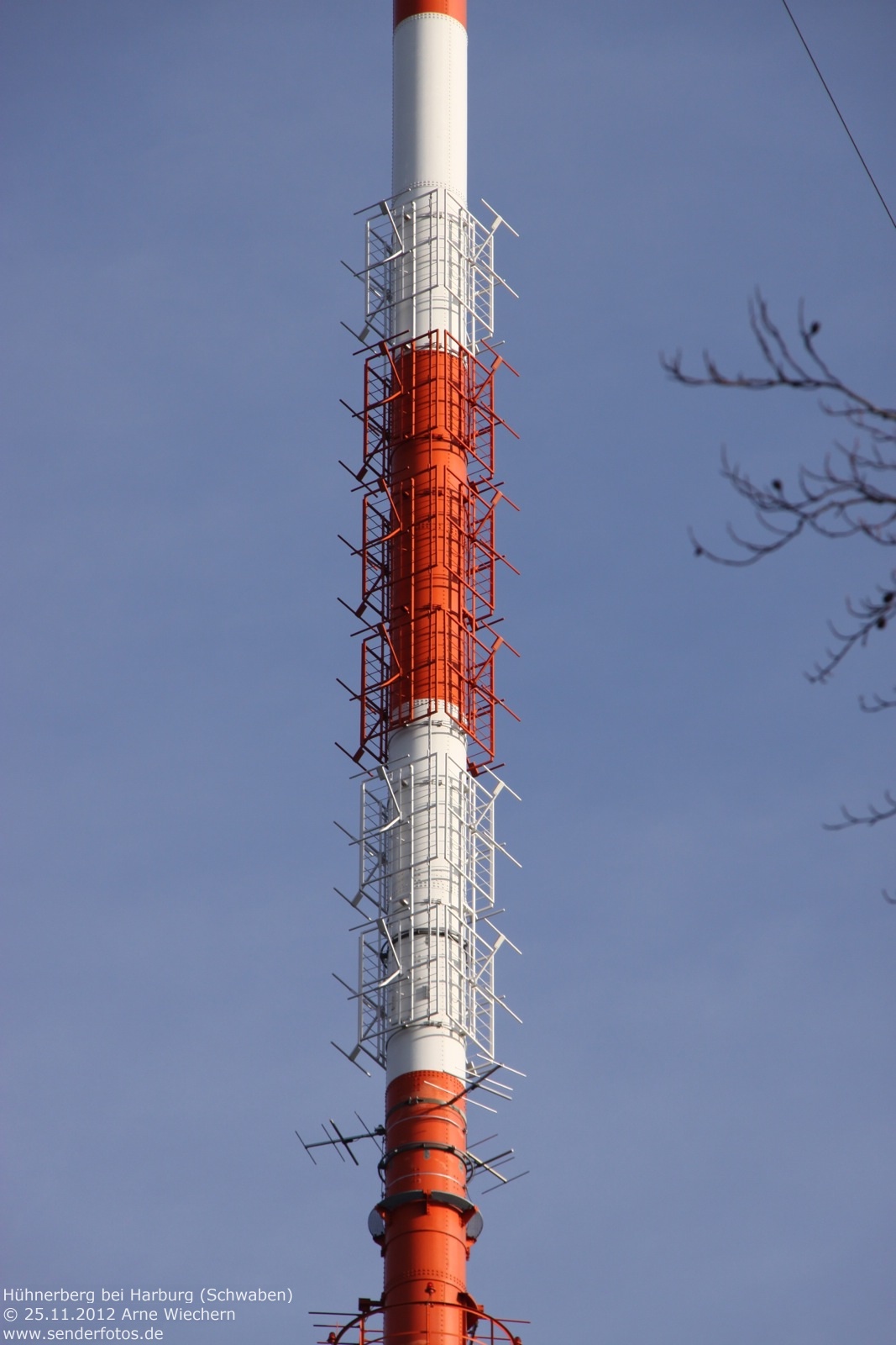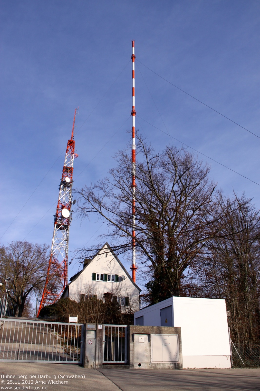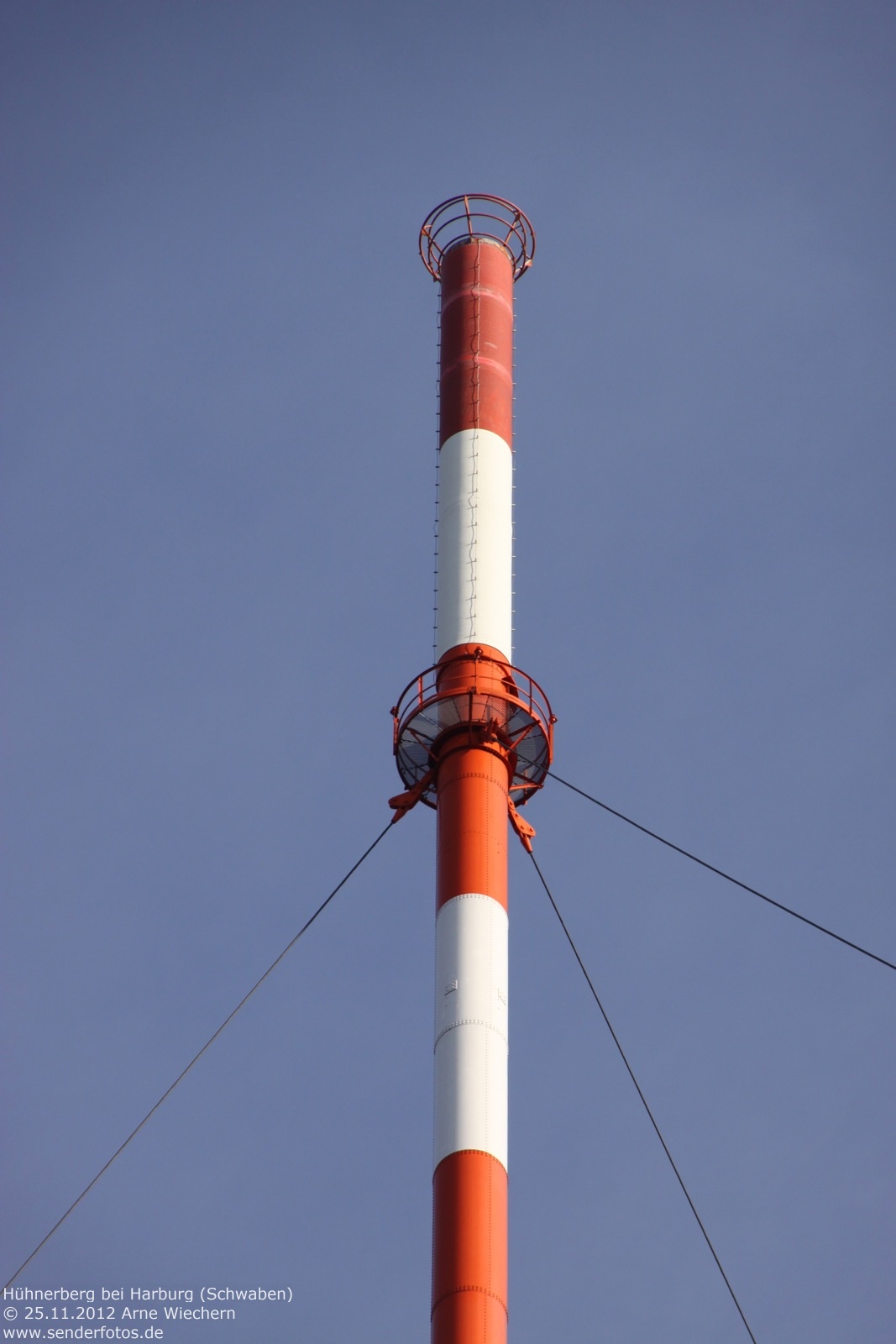 (BR) 25.11.2012: Bereits seit 1952 befinden sich Sendeanlagen des Bayerischen Rundfunks auf dem 570 m hohen Hühnerberg. Von 1952 bis 1965 diente hierzu ein 49 m hoher Stahlfachwerkturm, der heute noch für Richtfunk verwendet wird. Zur Ausstrahlung von Hörfunk und Fernsehen wurde seit 1965 ein 212 m hoher Stahlrohrmast eingesetzt. Die TV-Ausstrahlung der ARD (Kanal 60 / 400 kW) endete im November 2008 mit Inbetriebnahme von DVB-T in dieser Region. Der GFK-Zylinder an der Mastspitze ist seitdem ohne Funktion. Hörfunk wird jedoch weiterhin ausgestrahlt: Bayern 1 (91,9 MHz / 25 kW), Bayern 2 (96,1 MHz / 25 kW), Bayern 3 (99,5 MHz / 25 kW), Bayern Klassik (93,1 MHz / 10 kW), B 5 aktuell (107,6 MHz/11 kW) und hitradio.rt1 Nordschwaben (95,6 MHz / 1 kW). Zudem wird das bayerische DAB+-Paket auf Kanal 12 D (1 kW) ausgestrahlt. 02.04.2014: Am 1. April 2014 ist der bisherige 212 m hohe Stahlrohrmast gesprengt werden. Bis zum September 2014 soll am selben Standort ein neuer Mast entstehen, der dann auch in der Lage ist, neue Antennen für Digitalradio zu tragen. Dazu wäre der alte Mast nach Auskunft des BR aus statischen Gründen nicht mehr in der Lage gewesen. In der Übergangszeit dient ein 85 m hoher Kran als provisorischer Antennenträger. Die Sendeleistung bleibt auf den am Kranausleger montierten Antennen unverändert. Durch die etwas verringerte Höhe im Vergleich zum Stahlrohrmast kann es in den Randbereichen des Versorgungsgebietes allerdings zu Einschränkungen kommen. 15.05.2020: Die Bilder aus dem Jahr 2018 zeigen den neuen Stahlgittermast, der den Stahlrohrmast ersetzt hat. Im DAB+-Modus wird das Bayern-Multiplex des Bayerischen Rundfunks heute auf Kanal 11D mit 10 kW ausgestrahlt. Hinzu kommen die Multiplexe Obb/Schwaben (Kanal 10A/10 kW) und Augsburg (Kanal 9C/10 kW). Die Leistung des UKW-Senders für B5 aktuell (107,6 MHz) hat sich geändert. Das Programm wird heute mit 20 kW statt mit 11 kW ausgestrahlt.